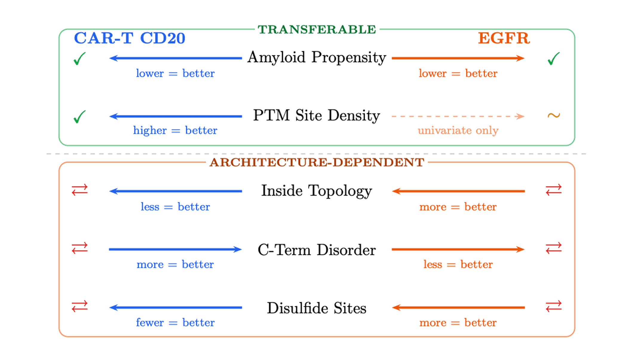 Some signals are architecture-dependent. Topology-like character, disorder, and disulfide-related features were significant in both datasets, but they flipped direction between contexts. A feature associated with success in a membrane-displayed CAR-T binder could be associated with failure in a standalone EGFR binder, and vice versa.