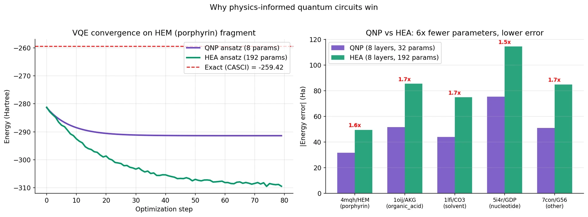 Why this matters for quantum ML broadly. The generic wisdom in deep learning is “more parameters, more expressivity, better results.” The quantum result is the opposite: encoding physical symmetries gives you a dramatically better inductive bias. A circuit that can only produce physically valid states finds the right answer faster than a circuit that can produce anything.
