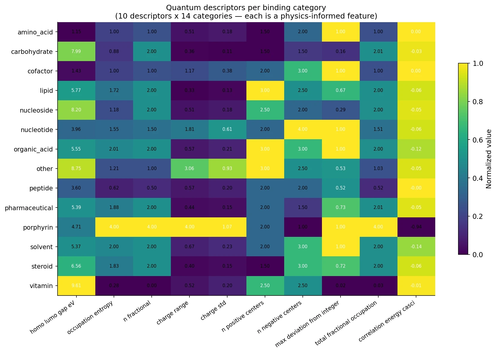 The key insight: these 10 numbers are different information than any classical feature. Sequence-based features tell you “this residue is a histidine near a hydrophobic pocket.” Quantum descriptors tell you “this binding environment has strong electron correlation and significant charge transfer character.” The two describe different aspects of the same molecular reality.