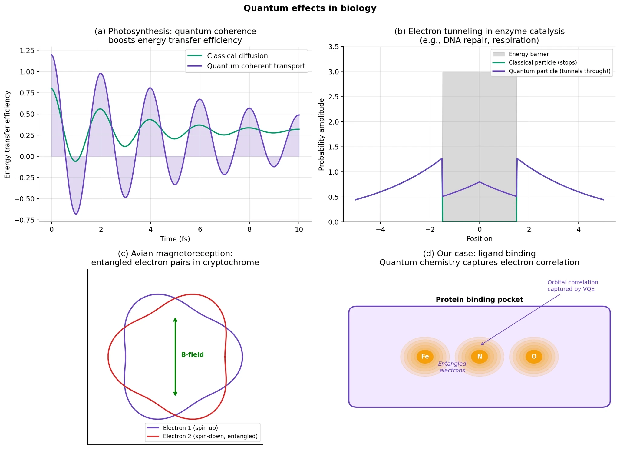When a small molecule binds to a protein, the interaction is ultimately governed by electrons: how charge redistributes, how orbitals interact, and how the local electronic environment changes. Classical force fields often approximate these effects very successfully, but some cases are harder than others, especially when binding depends on metal coordination, conjugated systems, charge transfer, or bond-making and bond-breaking. That is the real motivation here. Not the claim that biology is secretly a quantum computer, but the simpler idea that some biologically relevant interactions may benefit from more explicit quantum-informed features.