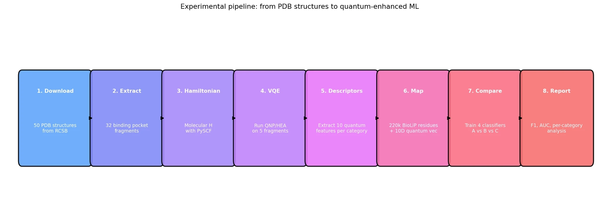 3. Category-level mapping. Every residue in a category gets the same 10-number quantum vector. Ideally you’d compute quantum features for each specific binding pocket geometry — but that’s 220,000 separate VQE calculations. Computationally prohibitive today. Cheaper quantum methods (DFT-based descriptors) could bridge this gap.