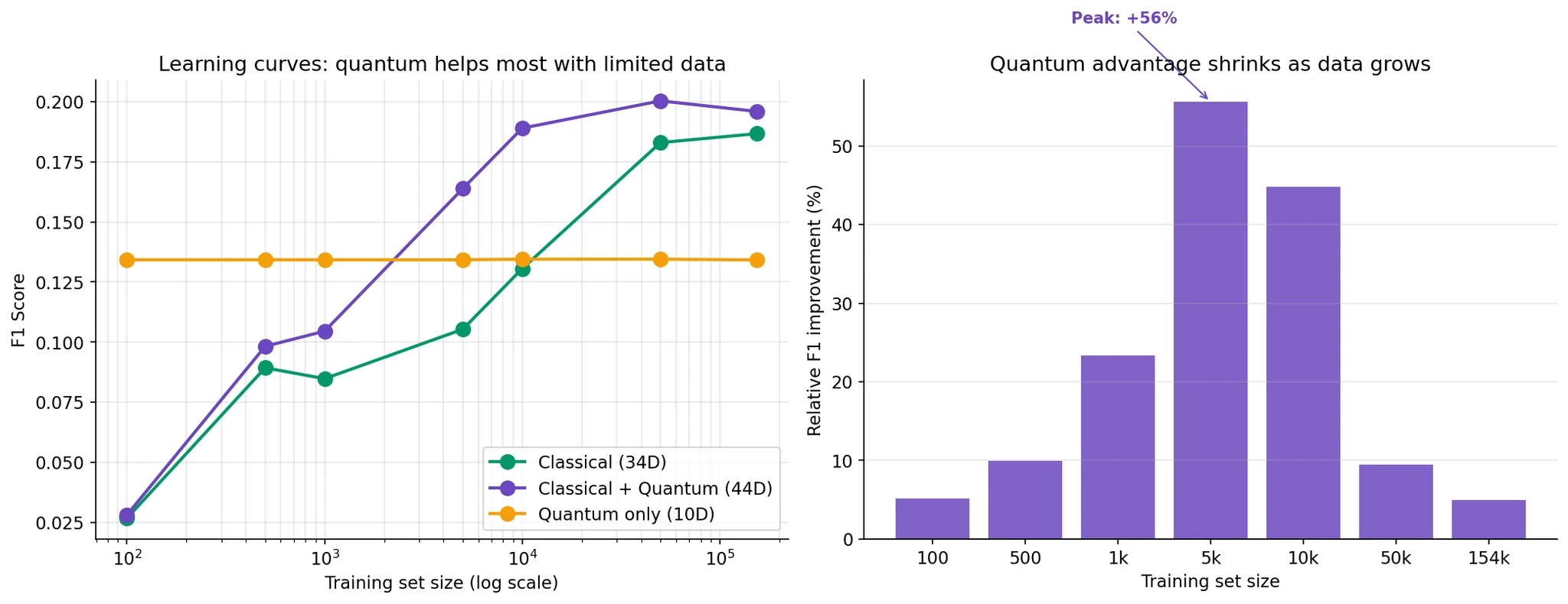 The left panel shows F1 as a function of training set size. Blue (classical) and purple (classical+quantum) both improve with more data, but the gap between them changes.
