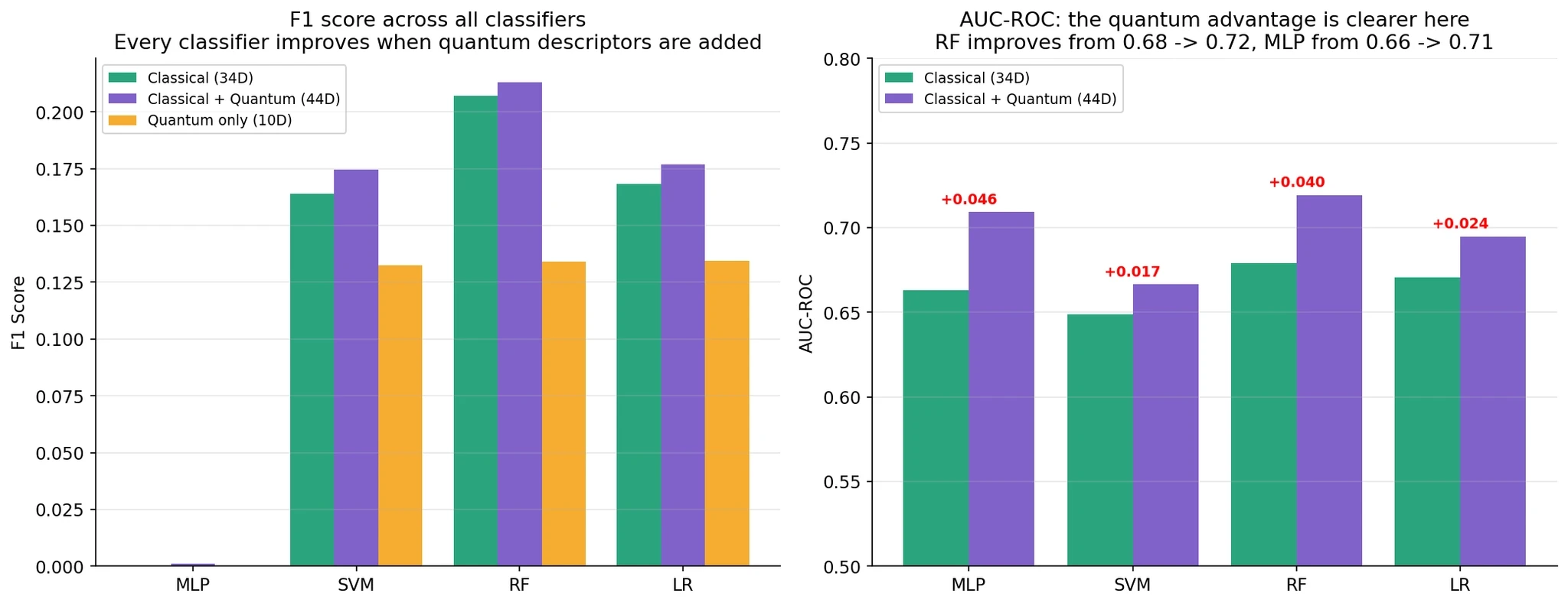 Every single classifier improves when you add quantum descriptors. F1 improvements are modest (0.65% average). AUC improvements are more substantial (2-5%). Setup C (quantum only) achieves 65-80% of the classical performance using just 10 features instead of 34 — quantum descriptors are information-dense.