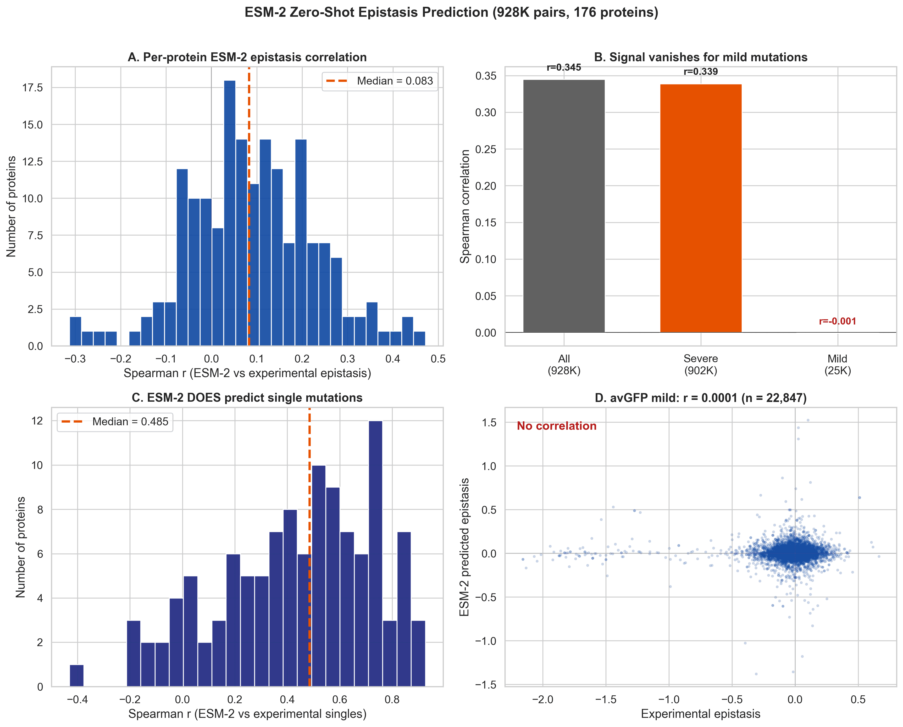 Our contribution was to show this systematically at scale, across 176 proteins and 962,375 double mutants, while also testing ESM-2 zero-shot epistasis prediction on 928,506 mutation pairs.