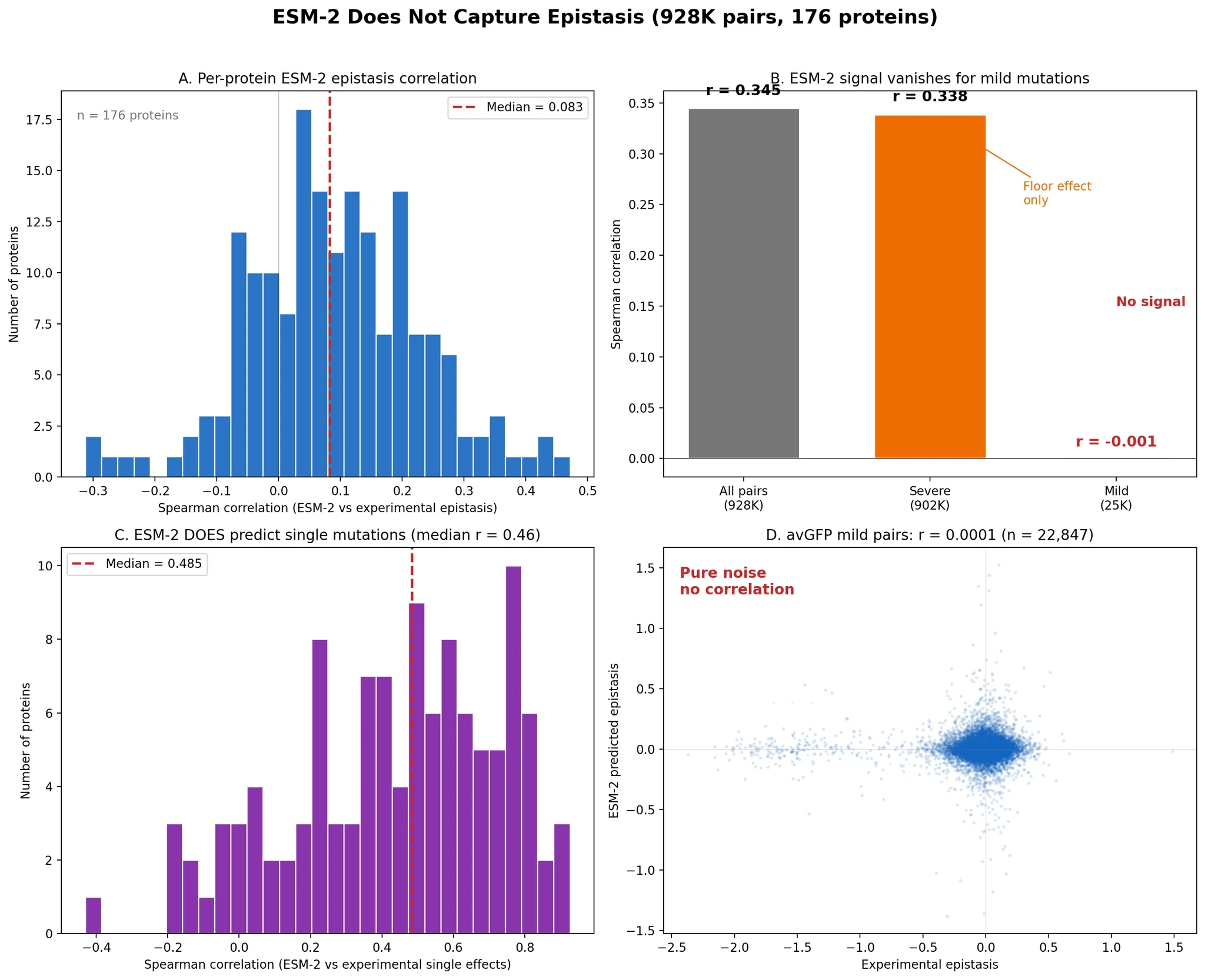 Figure 6. The apparent overall signal vanishes for mild mutation pairs. Meanwhile, ESM-2 still predicts single mutation effects reasonably well.