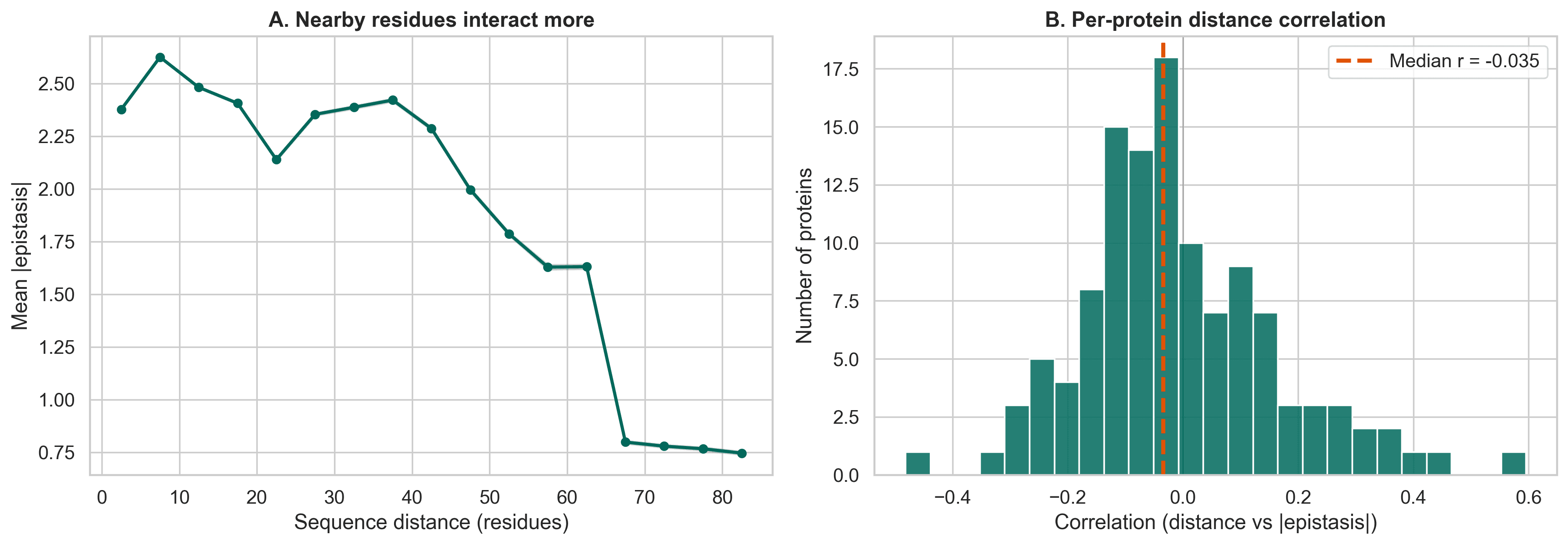 Nearby positions in sequence show stronger epistasis than distant ones. That suggests that real epistasis is tied to structural proximity, not just statistical distortion.