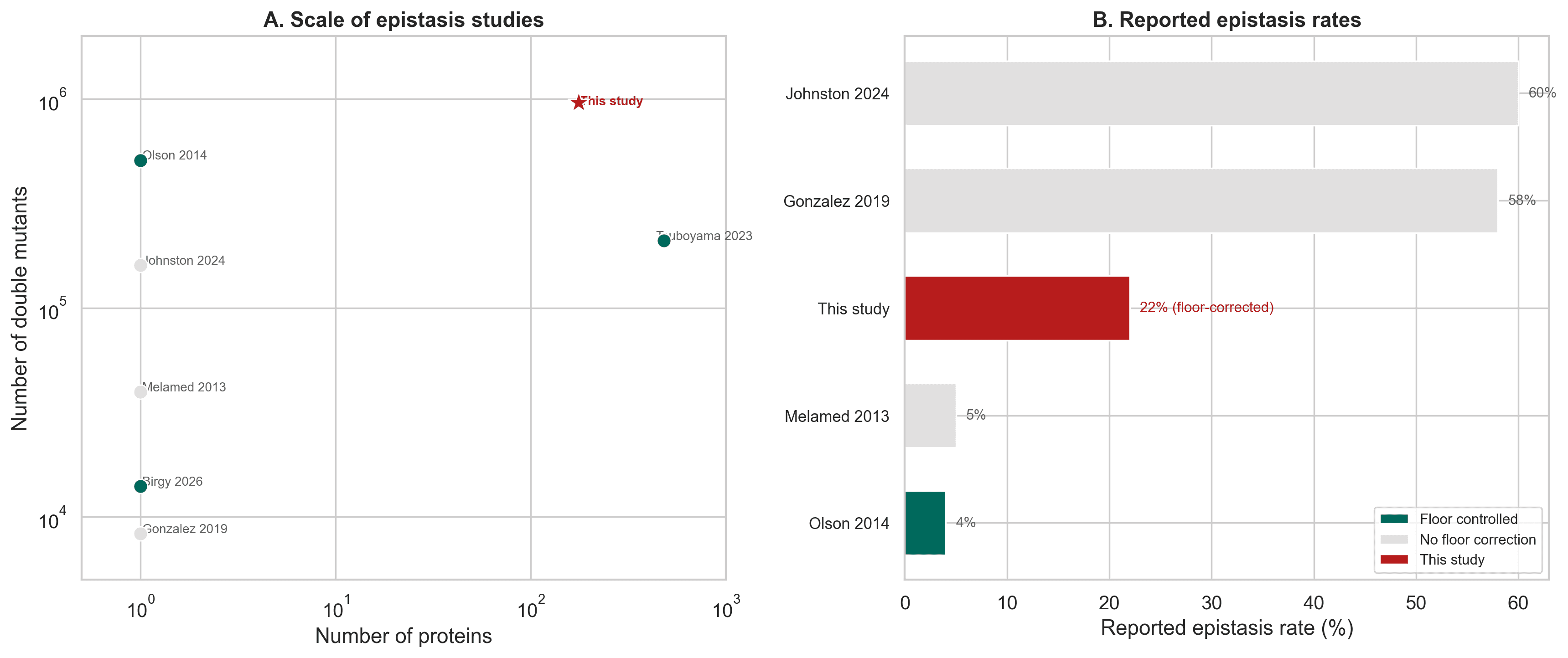 Figure 5. Compared with prior work, this study covers many more proteins and shows that floor corrected epistasis rates are far lower than many raw reports suggest.
