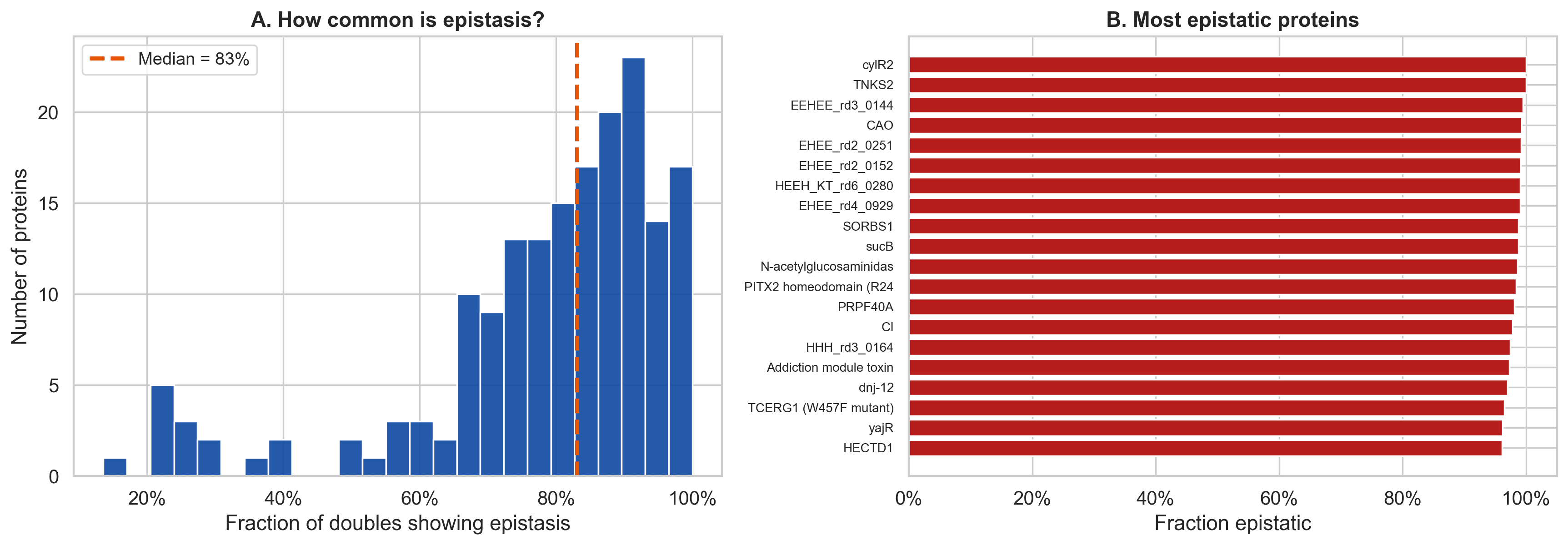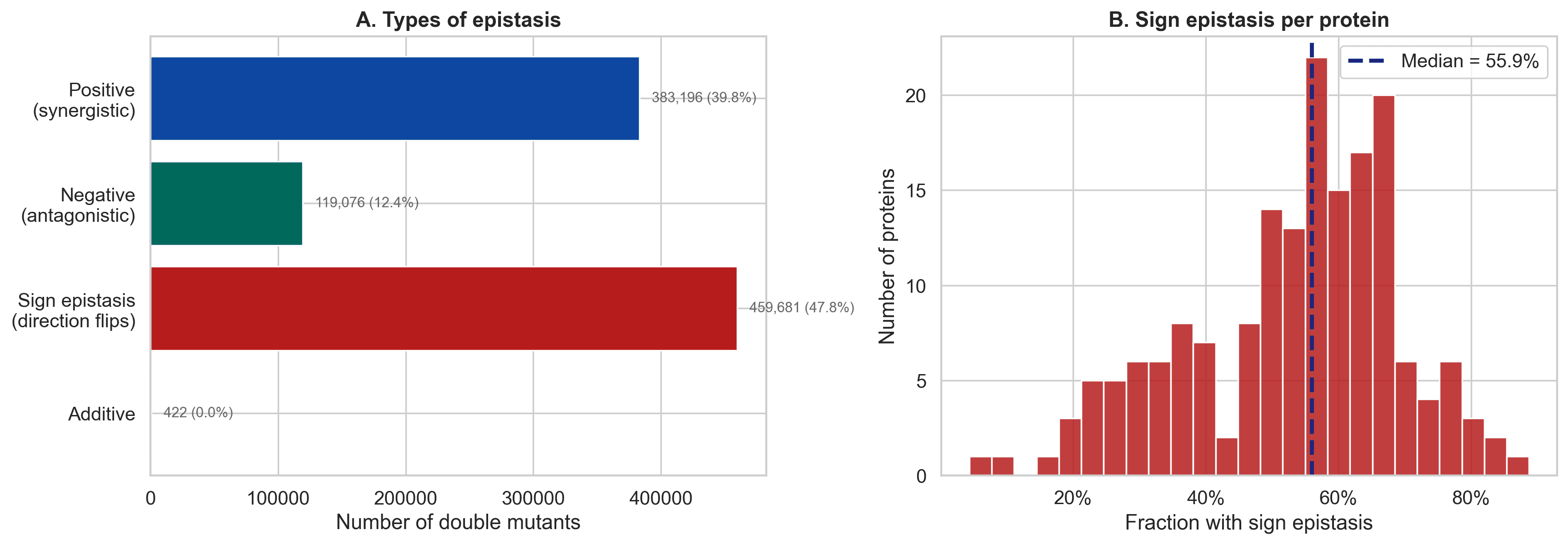 Figure 2. In raw measurements, epistasis appears extremely common across proteins, with a high median fraction of double mutants showing non additive behavior.