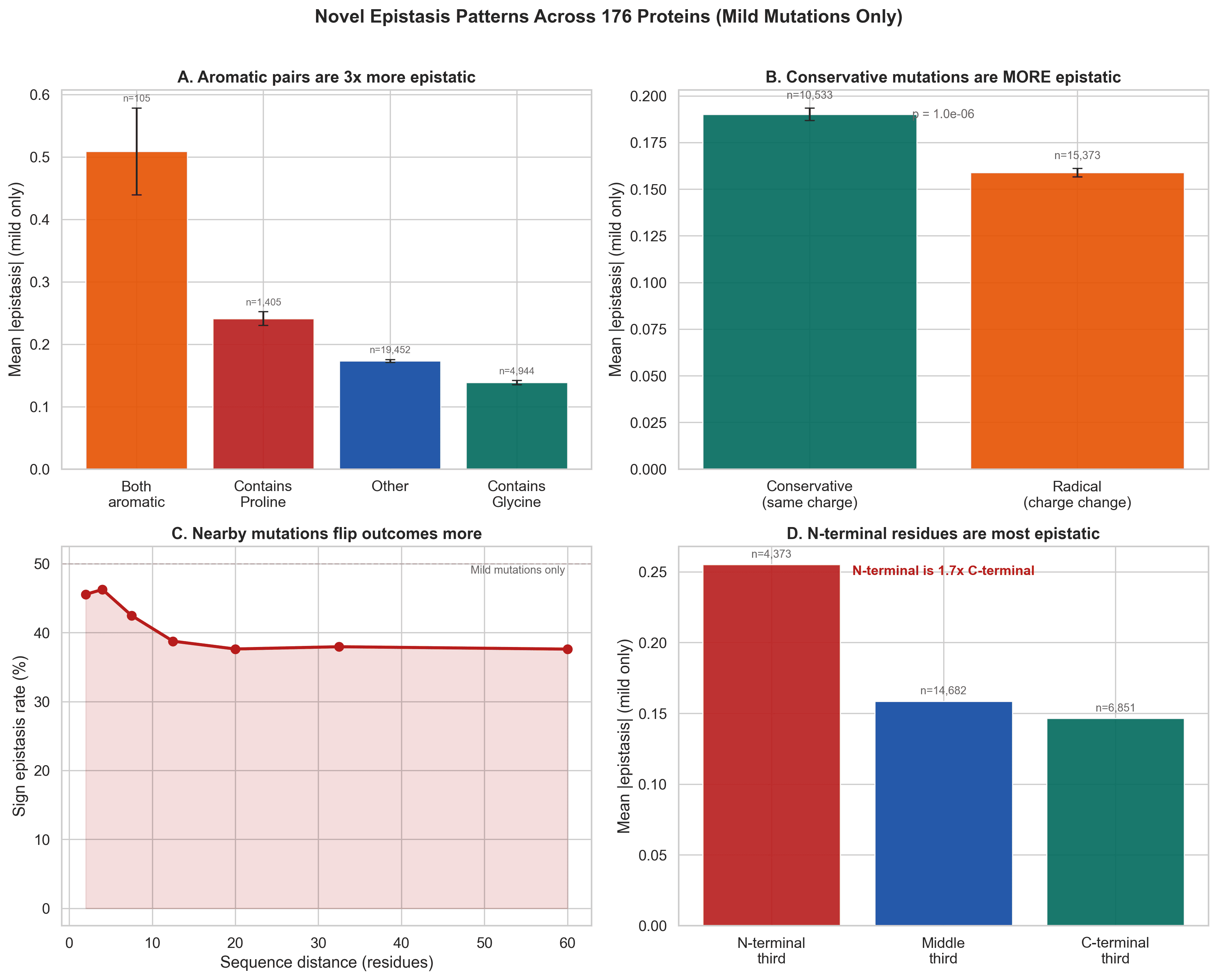 Figure 8. Mild-mutation analysis uncovers specific patterns that were hidden in the raw data, including aromatic effects, conservative substitution effects, sequence-distance dependence, and N-terminal enrichment.