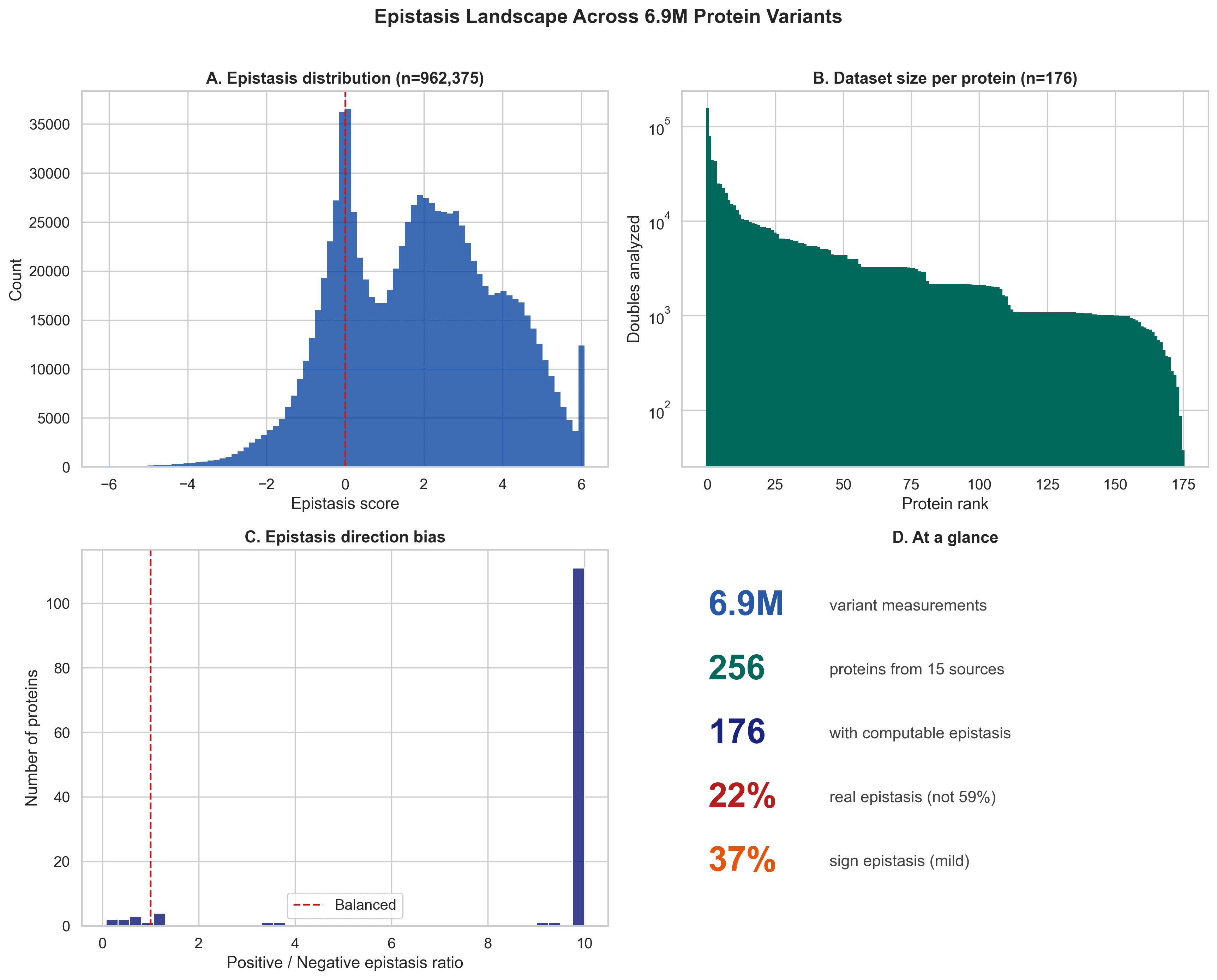 We assembled what is, to our knowledge, the largest open protein epistasis dataset to date: 6.9 million variant measurements across 256 proteins, collected from 15 public data sources. From that, we computed epistasis for 962,375 double mutants across 176 proteins, and then asked a simple but important question: