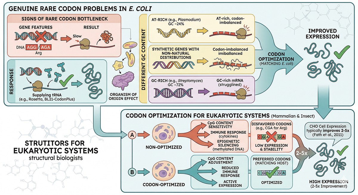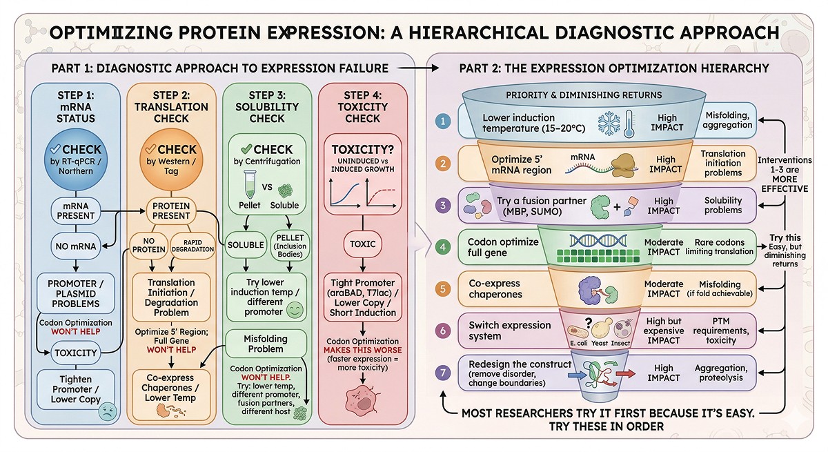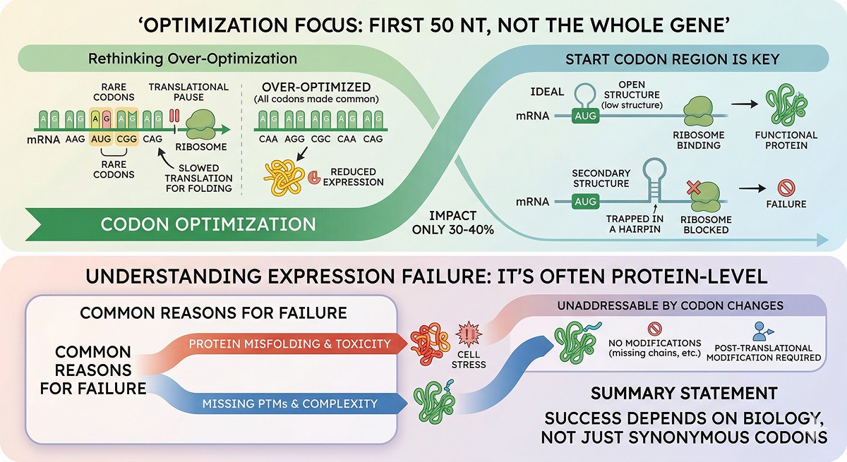 The core message: Codon optimization is one tool in the expression toolbox, not a magic fix. Diagnose the actual problem before spending money on gene synthesis. In most cases, the failure has nothing to do with codons.