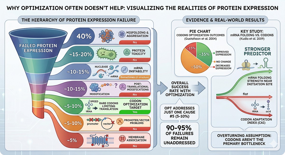Codon optimization addresses cause #5, which accounts for only 5–10% of expression failures. For the other 90–95%, it does nothing.
