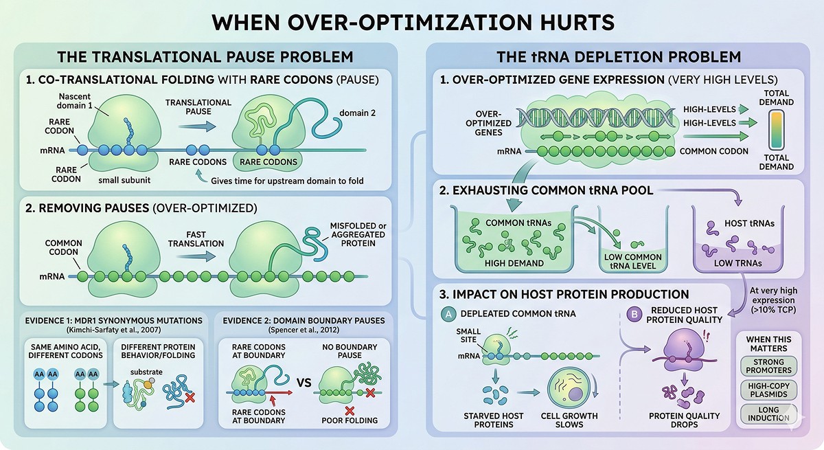 Some algorithms over-optimize, removing ALL rare codons (risks: translational pause removal, tRNA depletion)