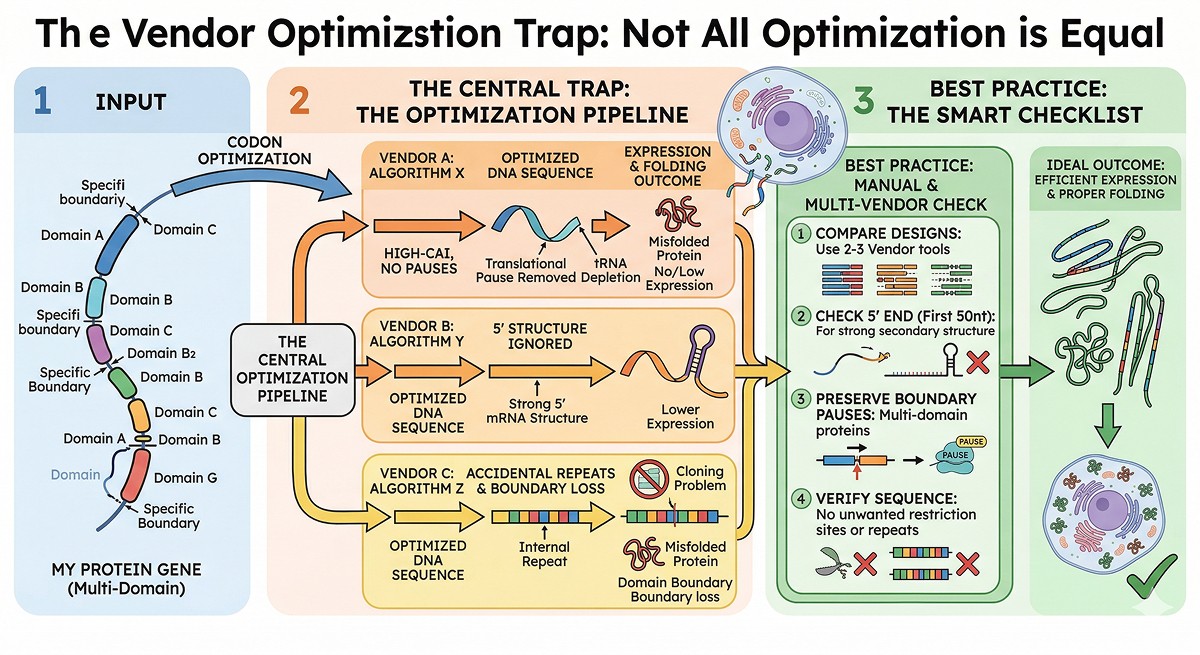 Different vendors use different algorithms. Testing the same protein with three vendors will give three different DNA sequences—and potentially different expression levels.