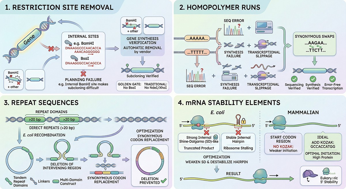 Homopolymers | Break up poly-A/T/G/C runs | Prevents sequencing/synthesis errors |