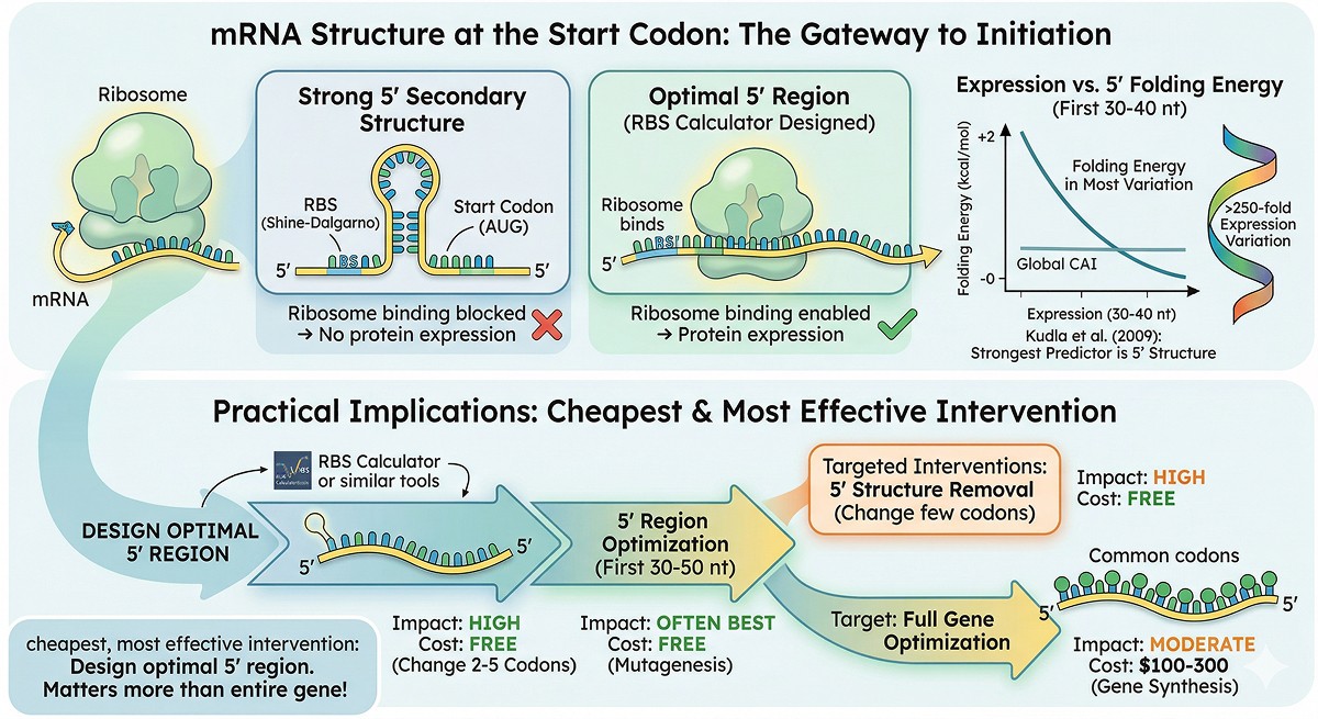 A systematic study by Kudla et al. (2009) demonstrated that for GFP variants in E. coli, mRNA folding near the translation initiation site was a stronger predictor of expression than codon adaptation index—overturning the assumption that rare codons are the primary bottleneck.