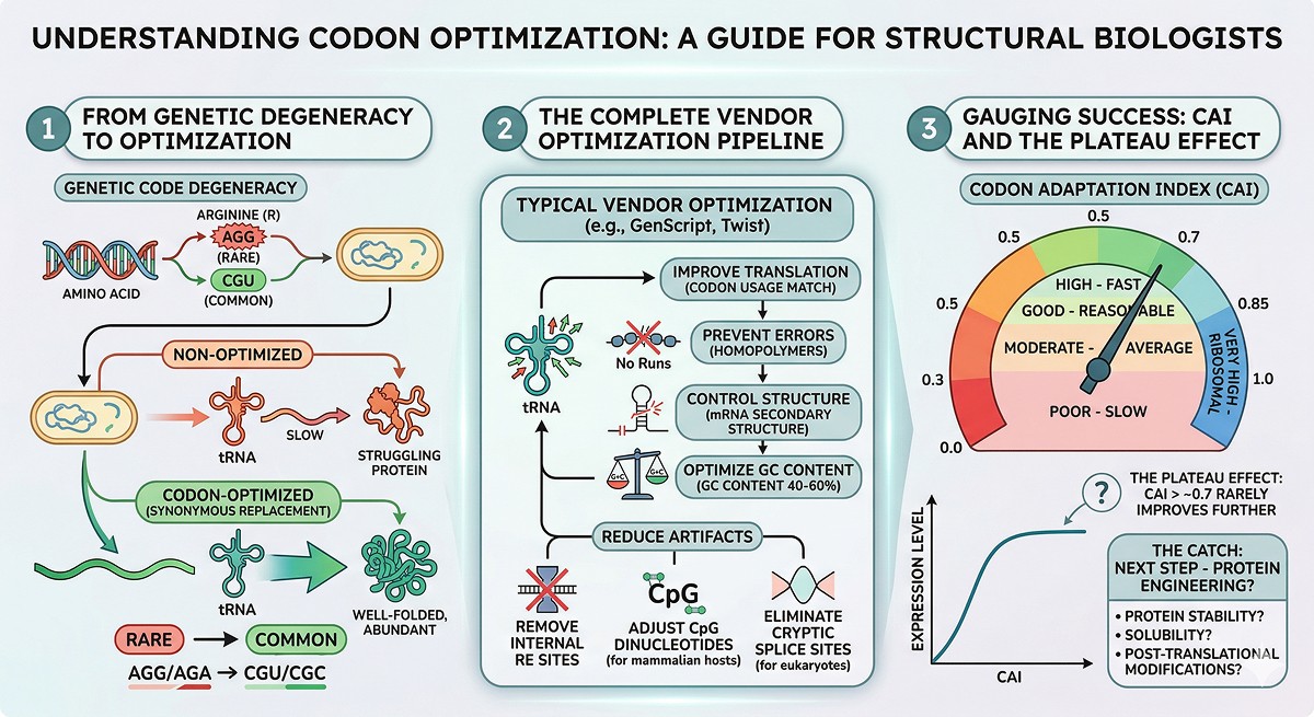 The catch: CAI above ~0.7 rarely improves expression further. The gains from optimization plateau, and the remaining expression problems are not codon-related.