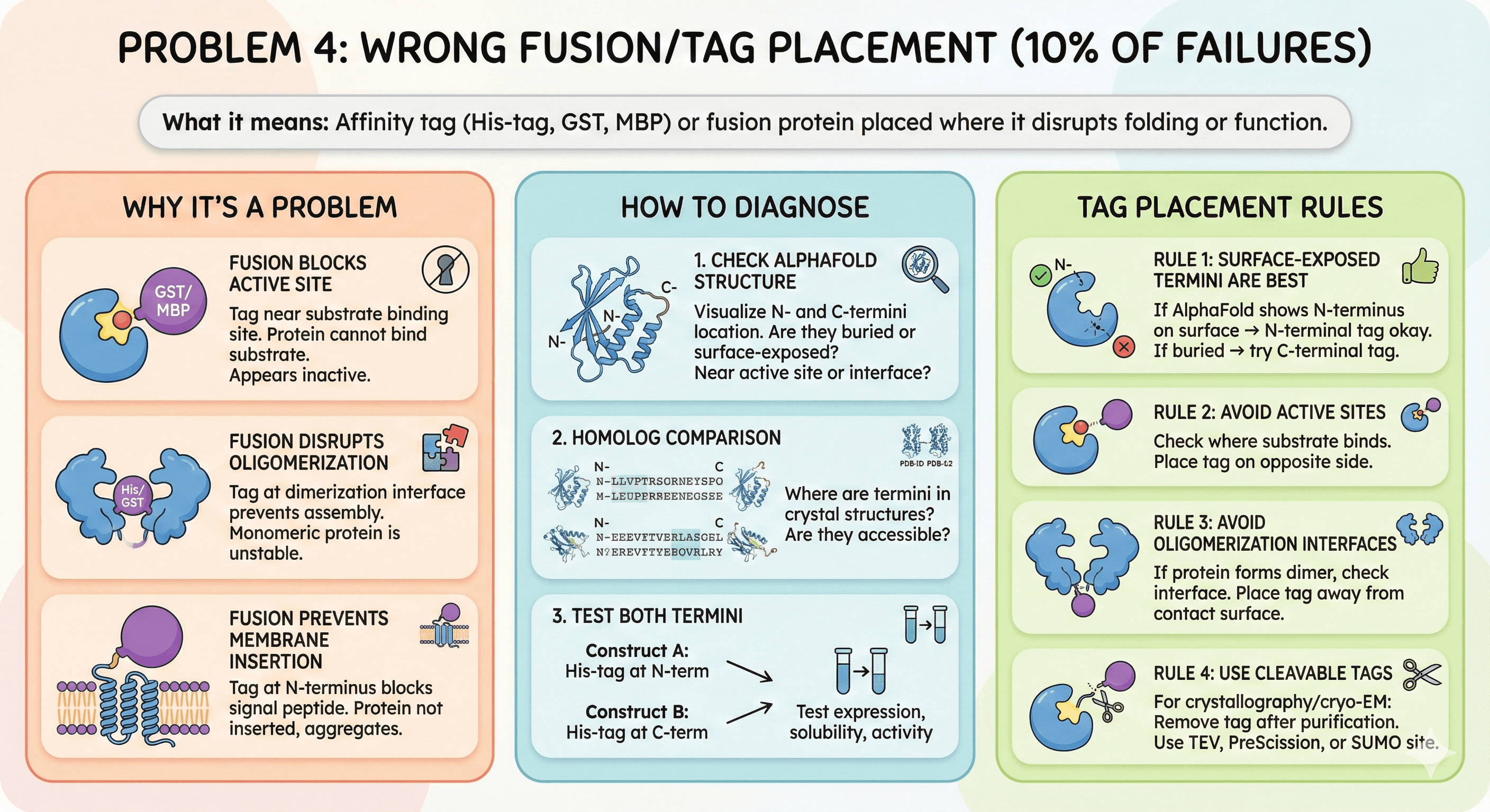 What it means: Affinity tag (His-tag, GST, MBP) or fusion protein placed where it disrupts folding or function.
