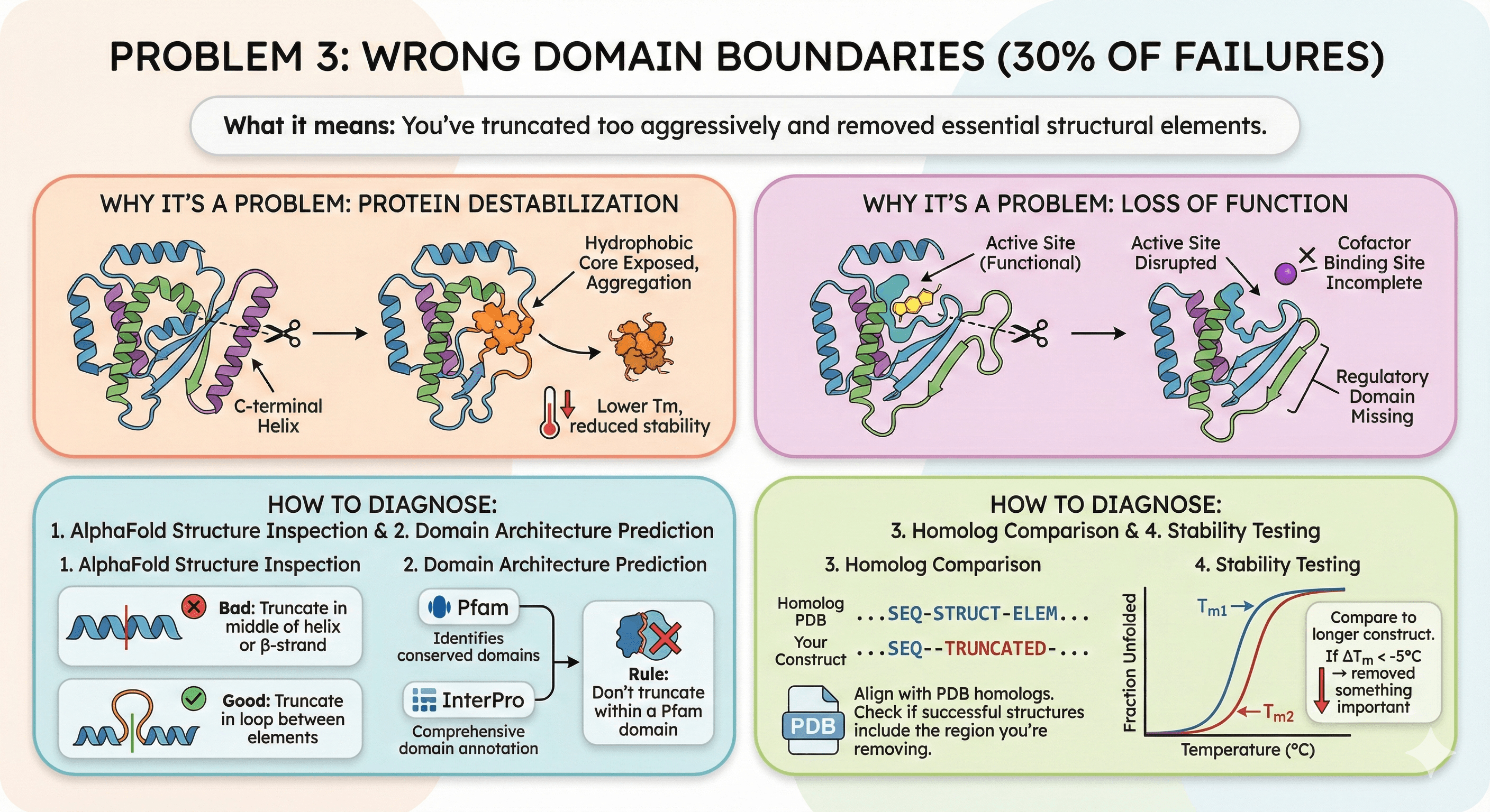 Protein insoluble after truncation | Wrong domain boundary | Check if cut through helix/strand |