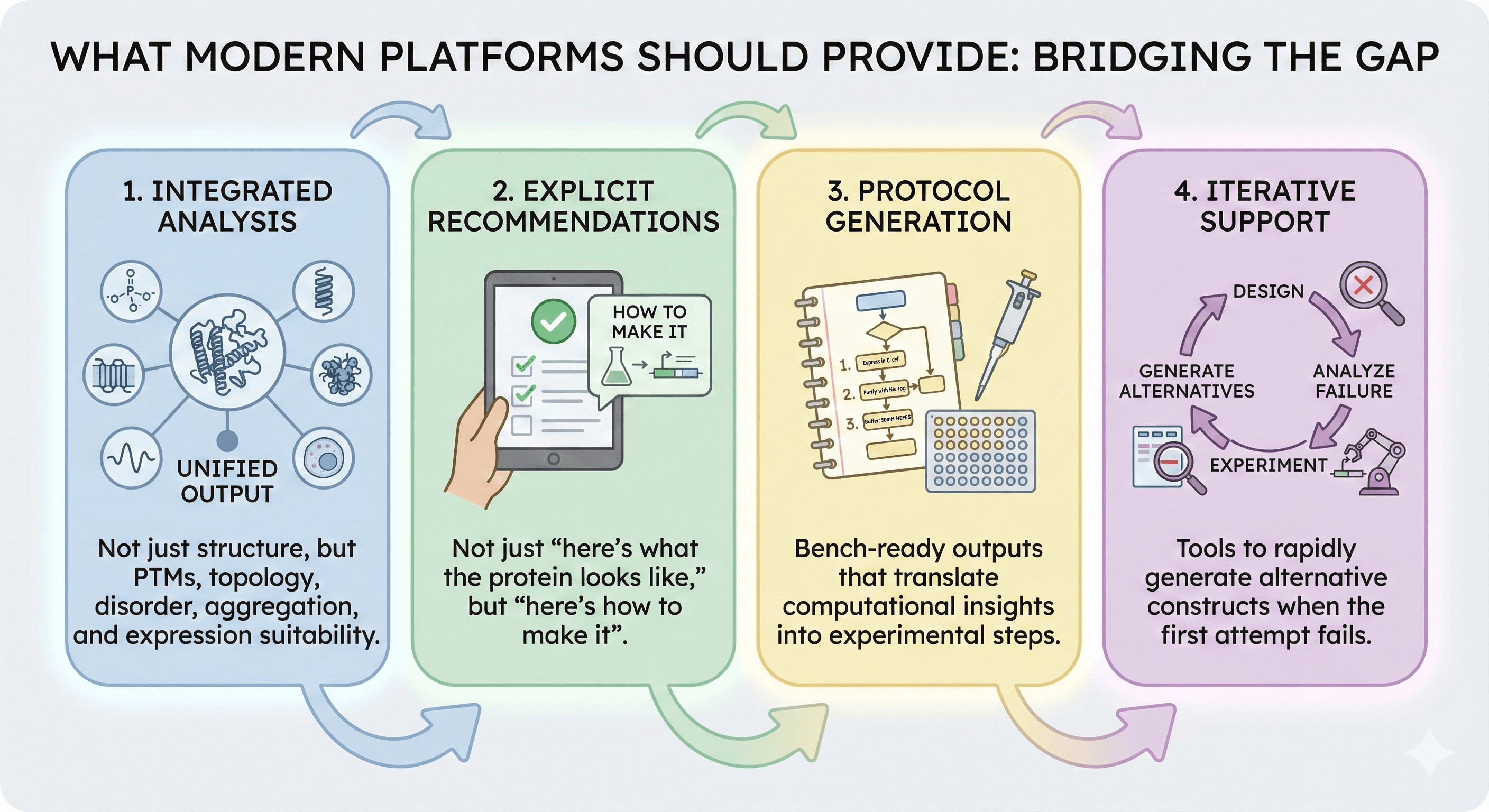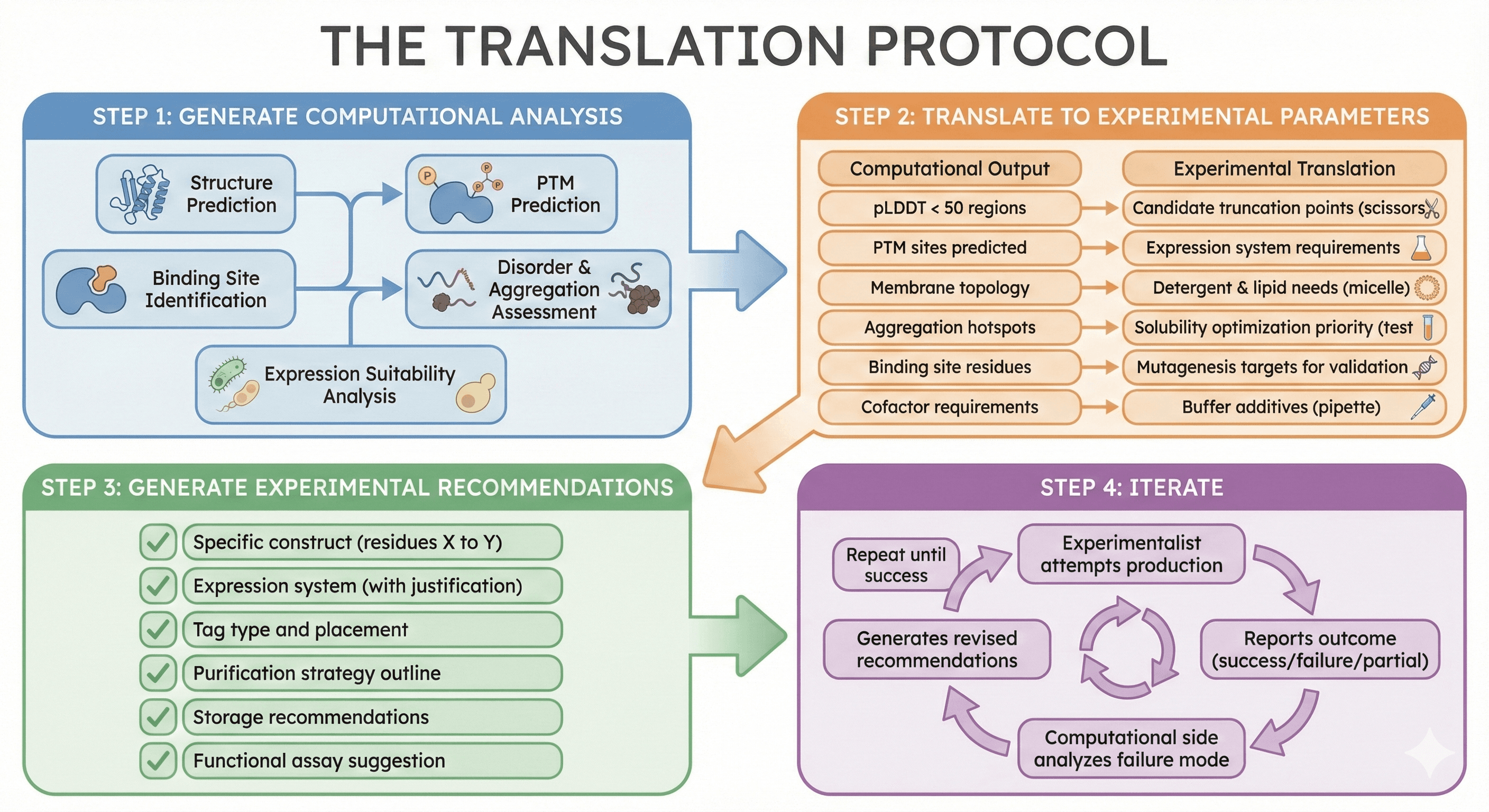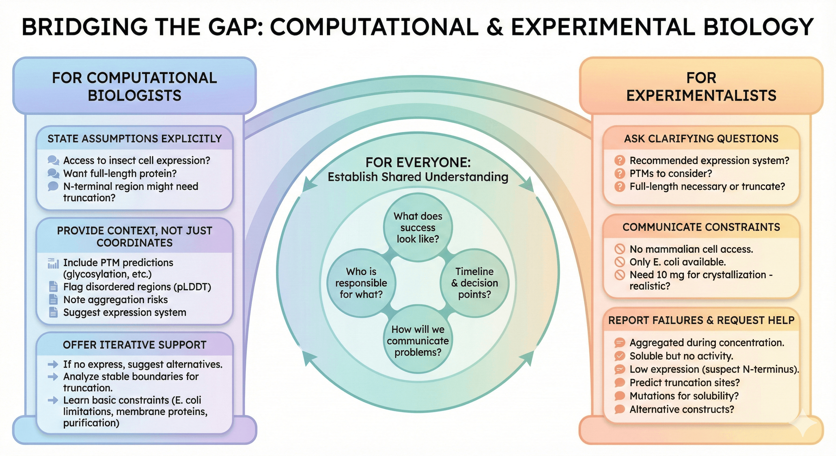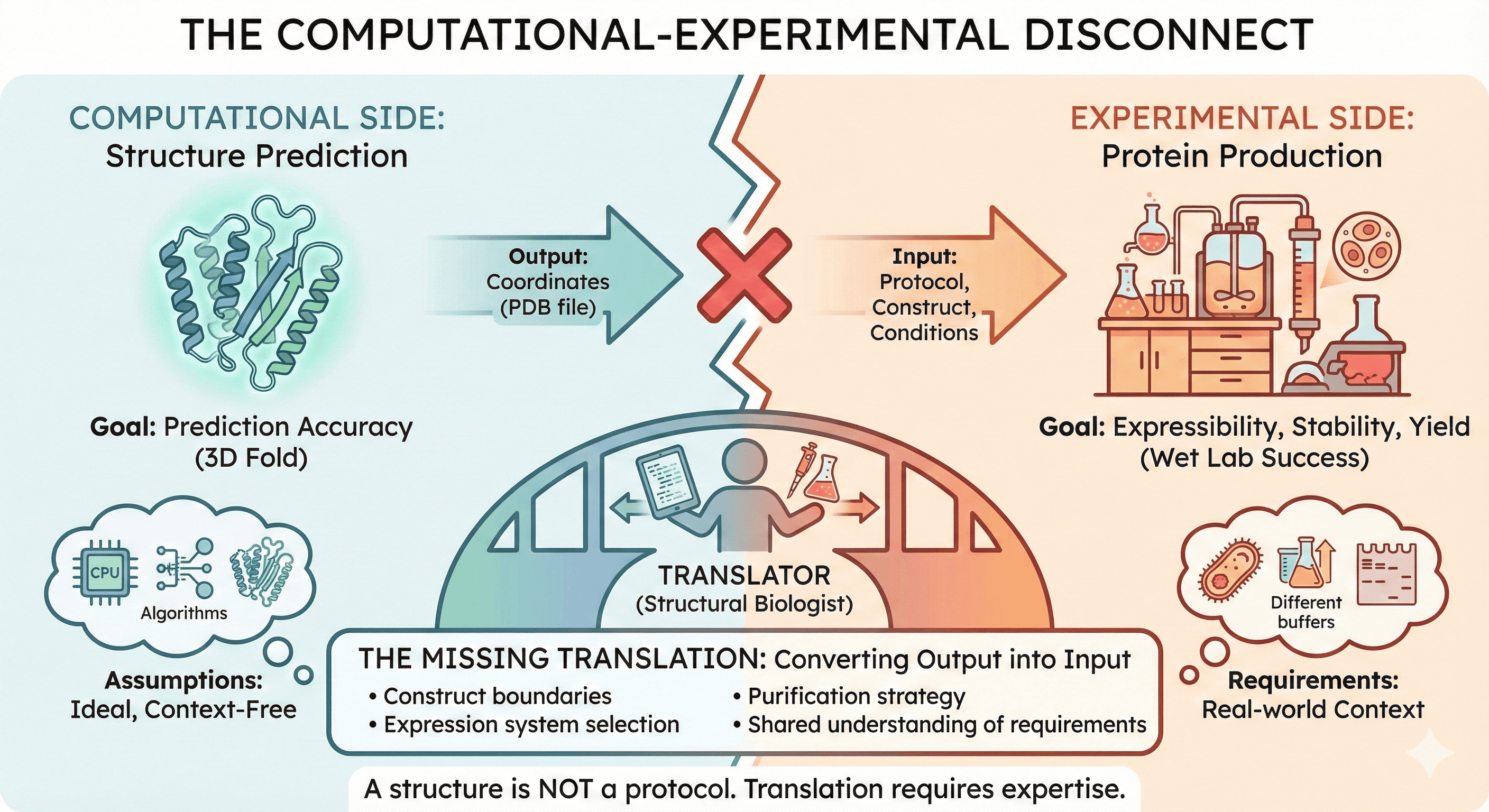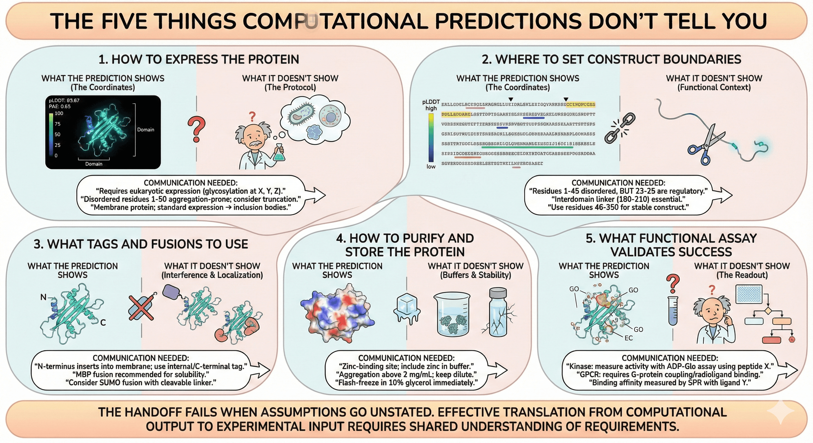 The goal is to make "here's the structure" into "here's how to make the protein"—before the experimentalist spends months discovering the hard way what the computational analysis could have predicted.