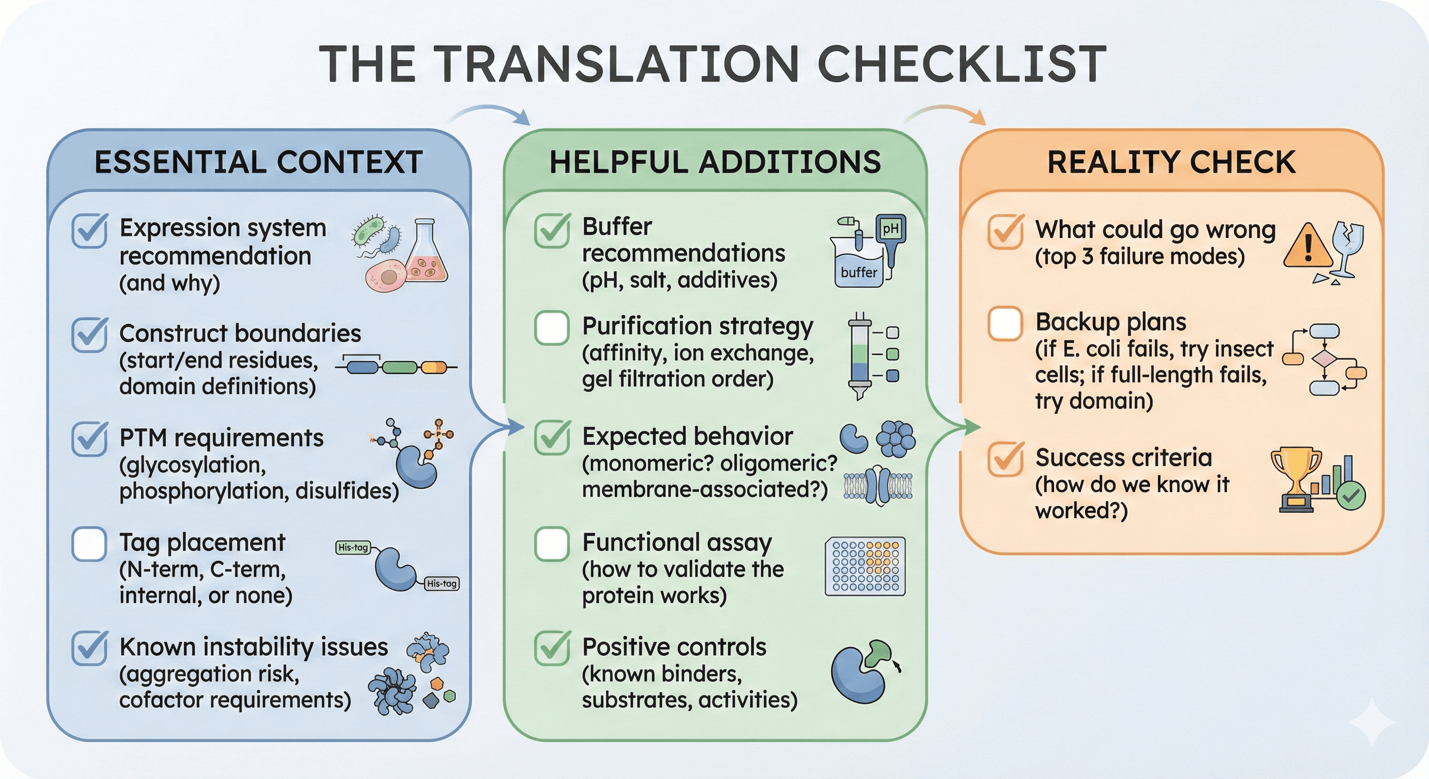 A collaborator says "add a His-tag for purification." The experimentalist adds an N-terminal His-tag. But the N-terminus is essential for membrane insertion—now the protein doesn't localize correctly. The purification "works" (protein is pure), but the functional assay fails.