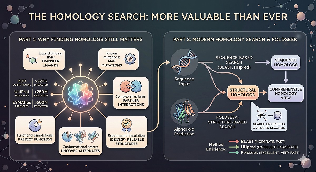 The game-changer: Foldseek enables structural similarity searches at sequence-search speeds. You can now search the entire AlphaFold DB and PDB by structure in seconds—finding homologs that share no detectable sequence similarity but have the same fold.