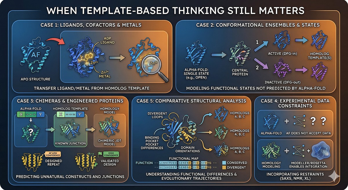 Homology modeling still matters for: complexes with specific templates, proteins with bound ligands/cofactors, engineered chimeras, and comparative analysis across homologs