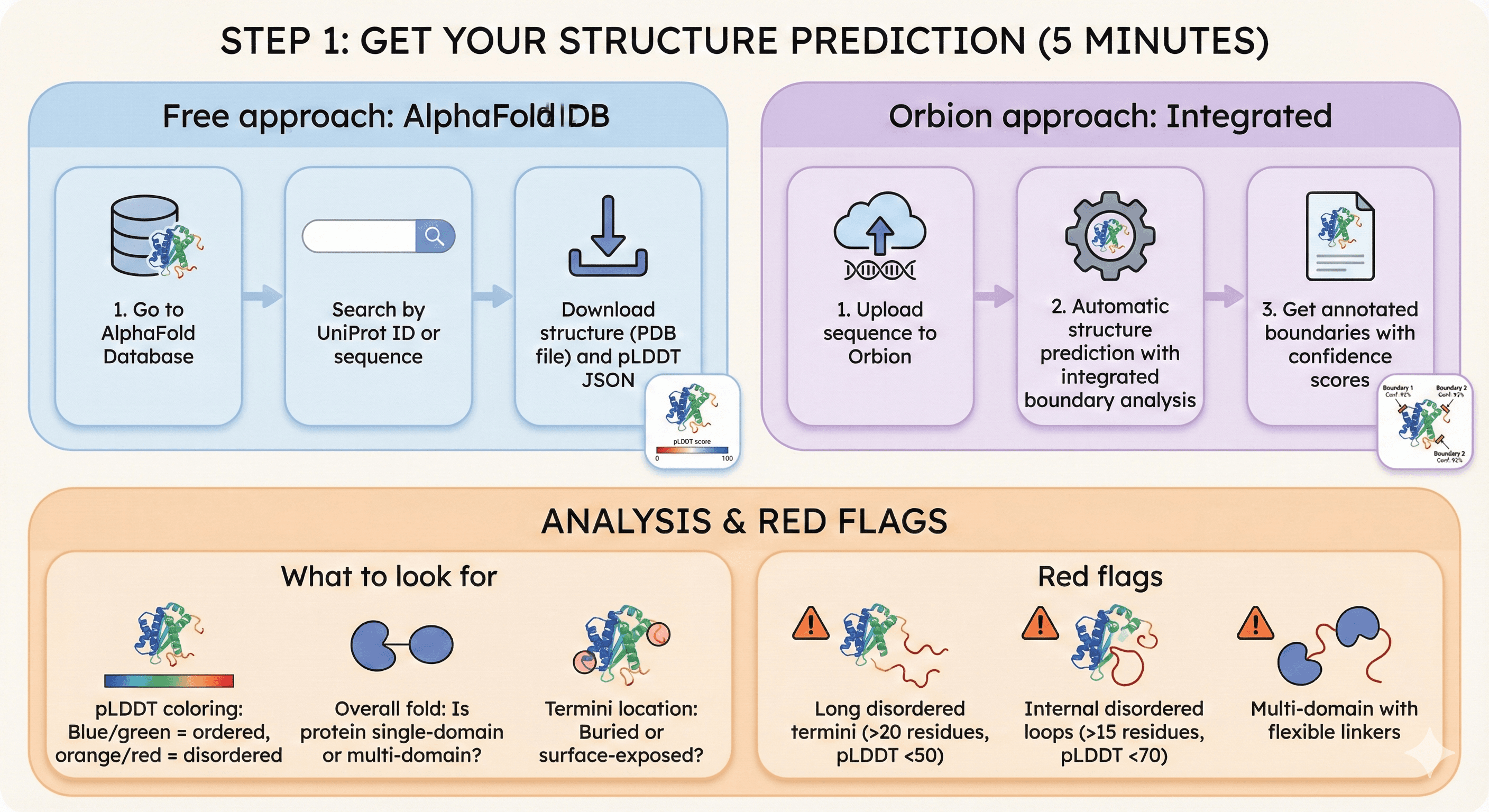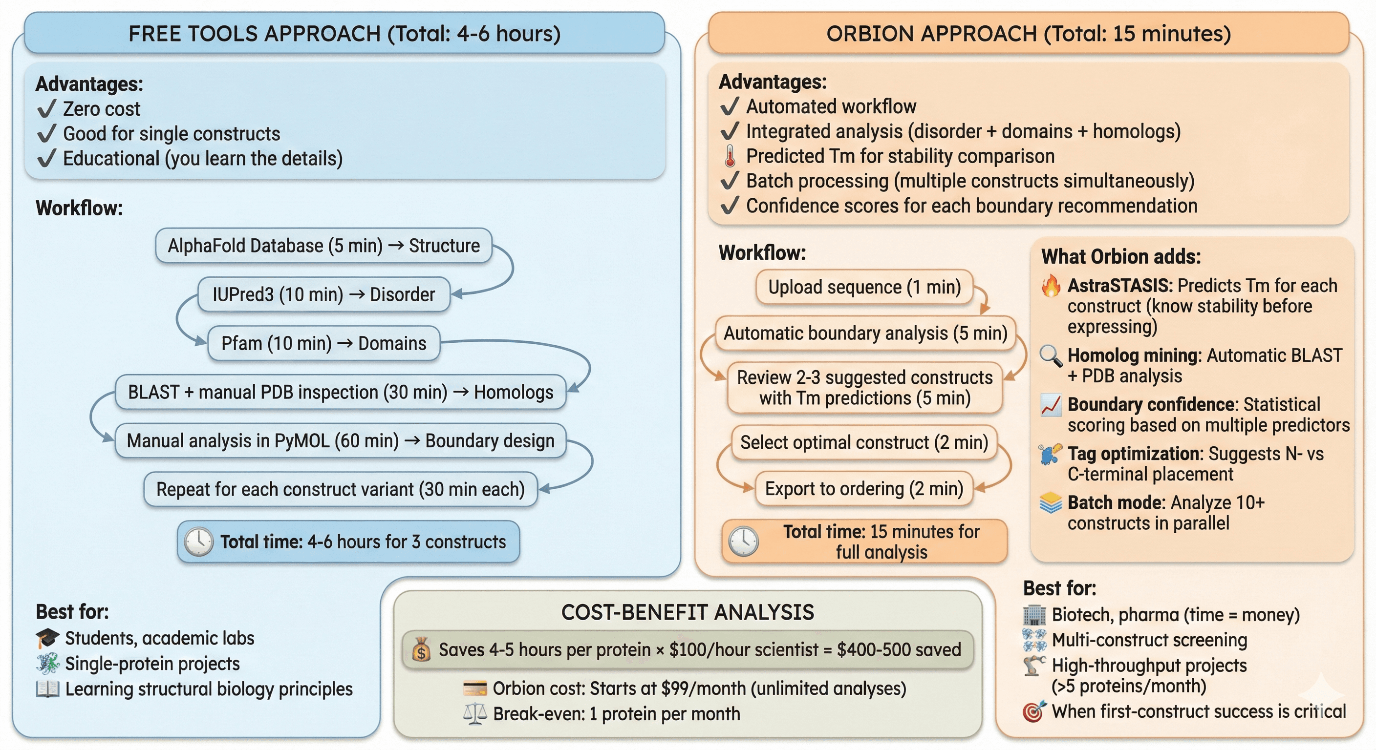 Tools: Free tools work (AlphaFold, IUPred), but Orbion reduces design time from 4-6 hours to 15 minutes