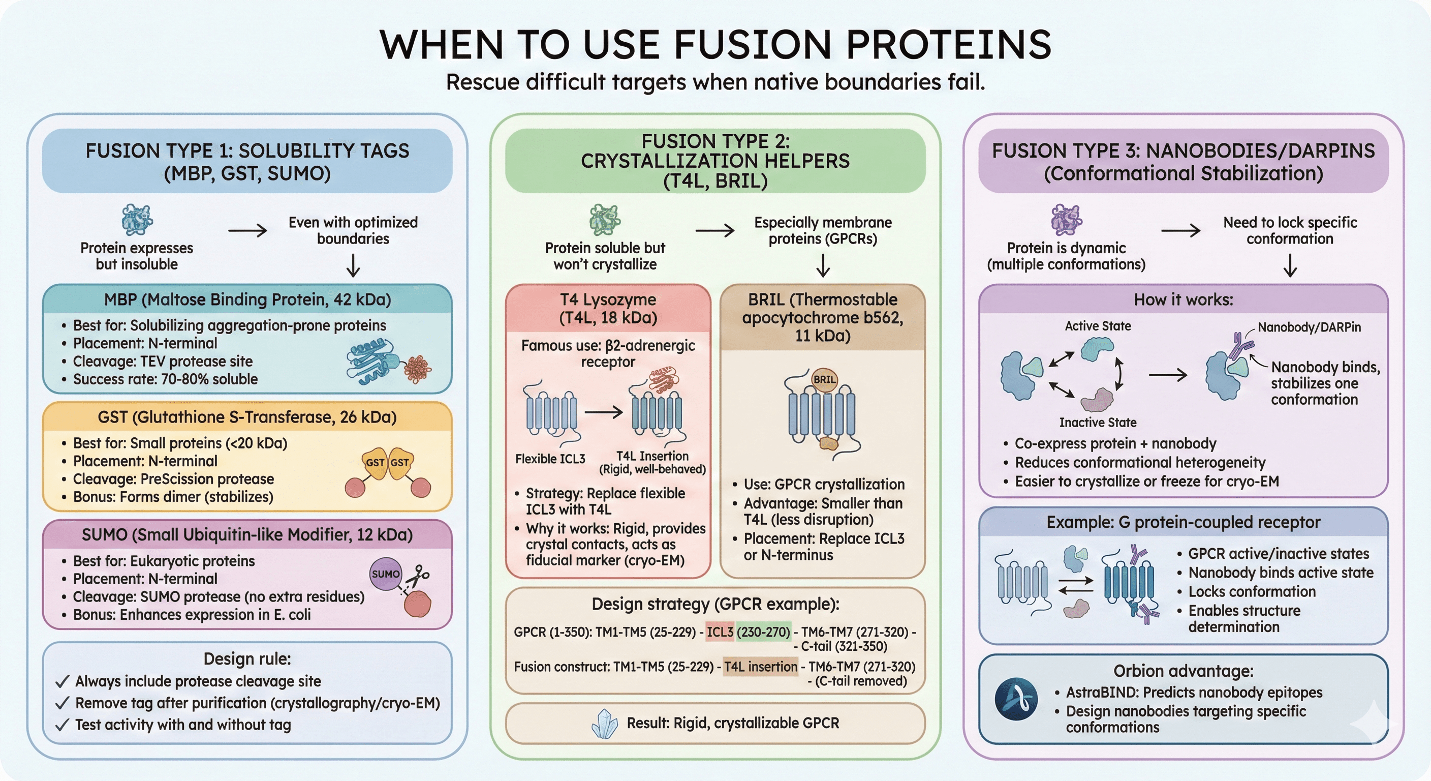 Fusion proteins: Use when native boundaries fail (GPCRs, unstable proteins)