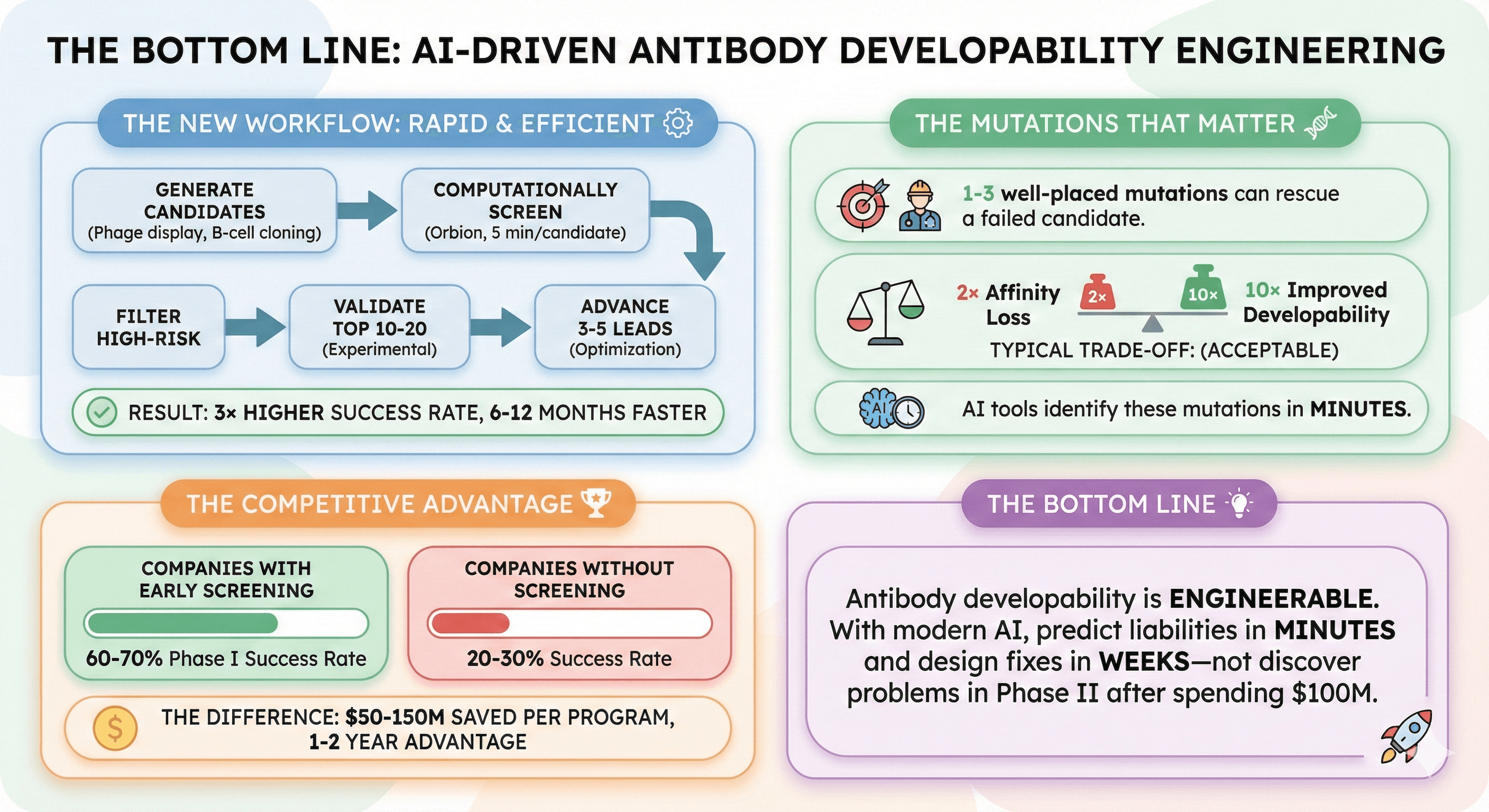The solution: Engineer developability into your candidate using AI-driven prediction and rational protein design. Here's the complete workflow, from computational screening to IND filing, with real rescue stories and practical protocols.
