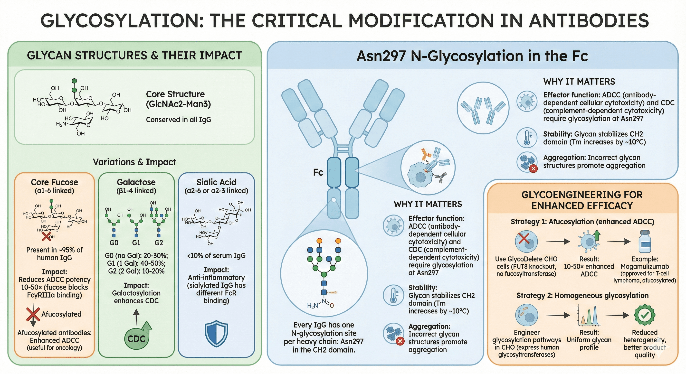 Glycosylation at Asn297 is critical for Fc effector function (ADCC/CDC)