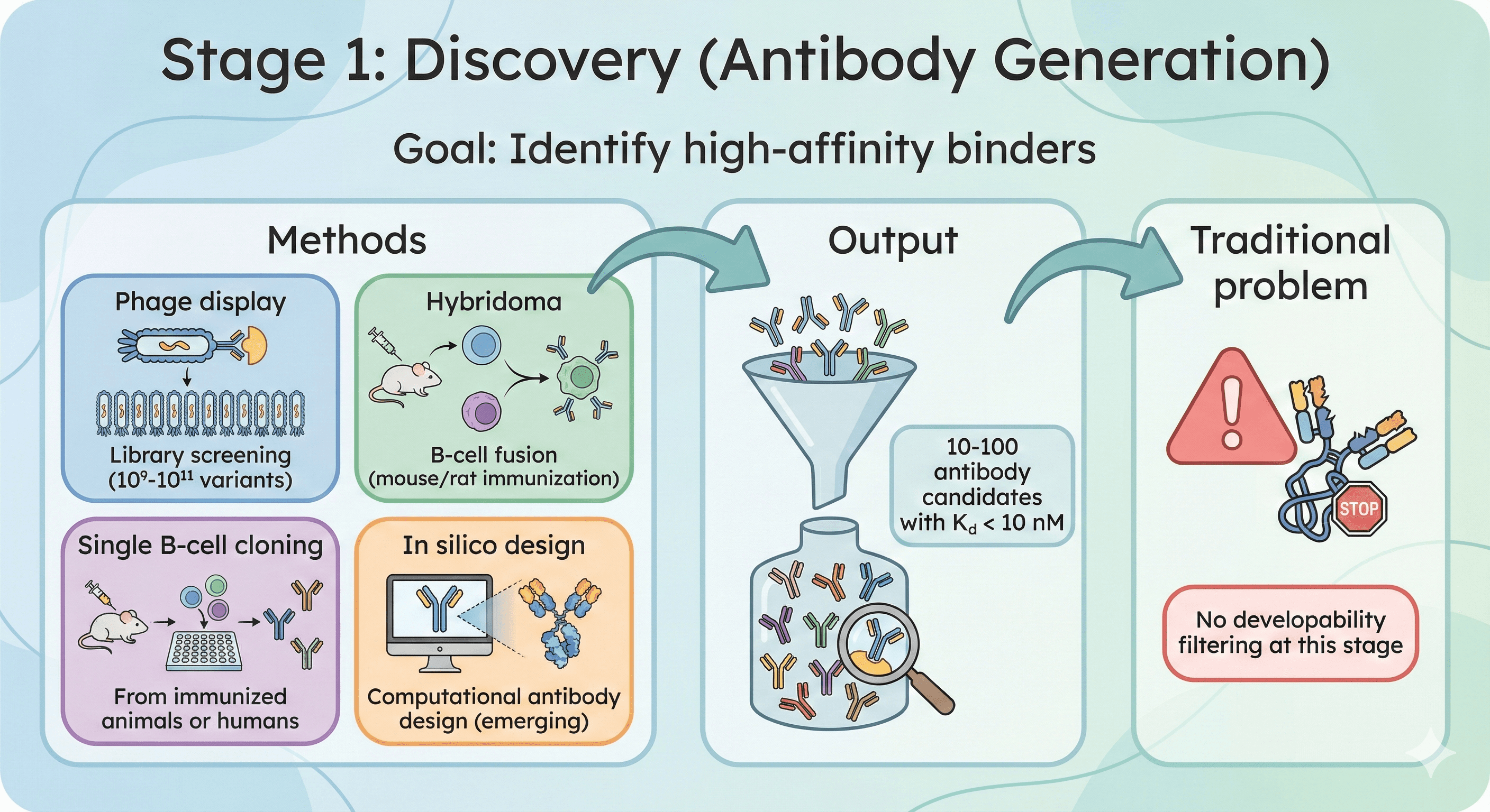 This is where the new paradigm differs from traditional approaches. Instead of advancing all high-affinity candidates, we computationally predict developability and filter early.