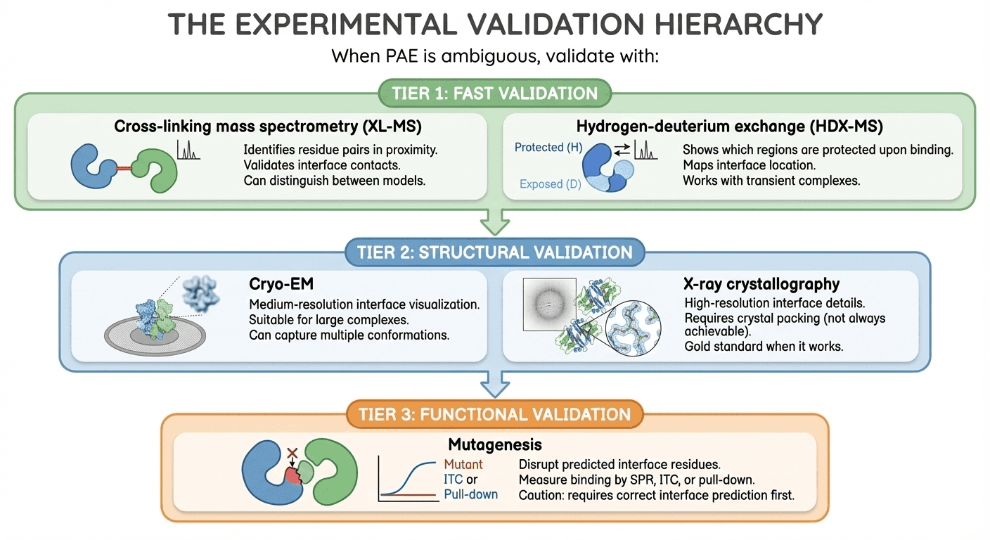 The fix: Look for consistent low PAE at specific residue pairs, not overall blue blocks. Map these residues to the structure—they should be at the interface.