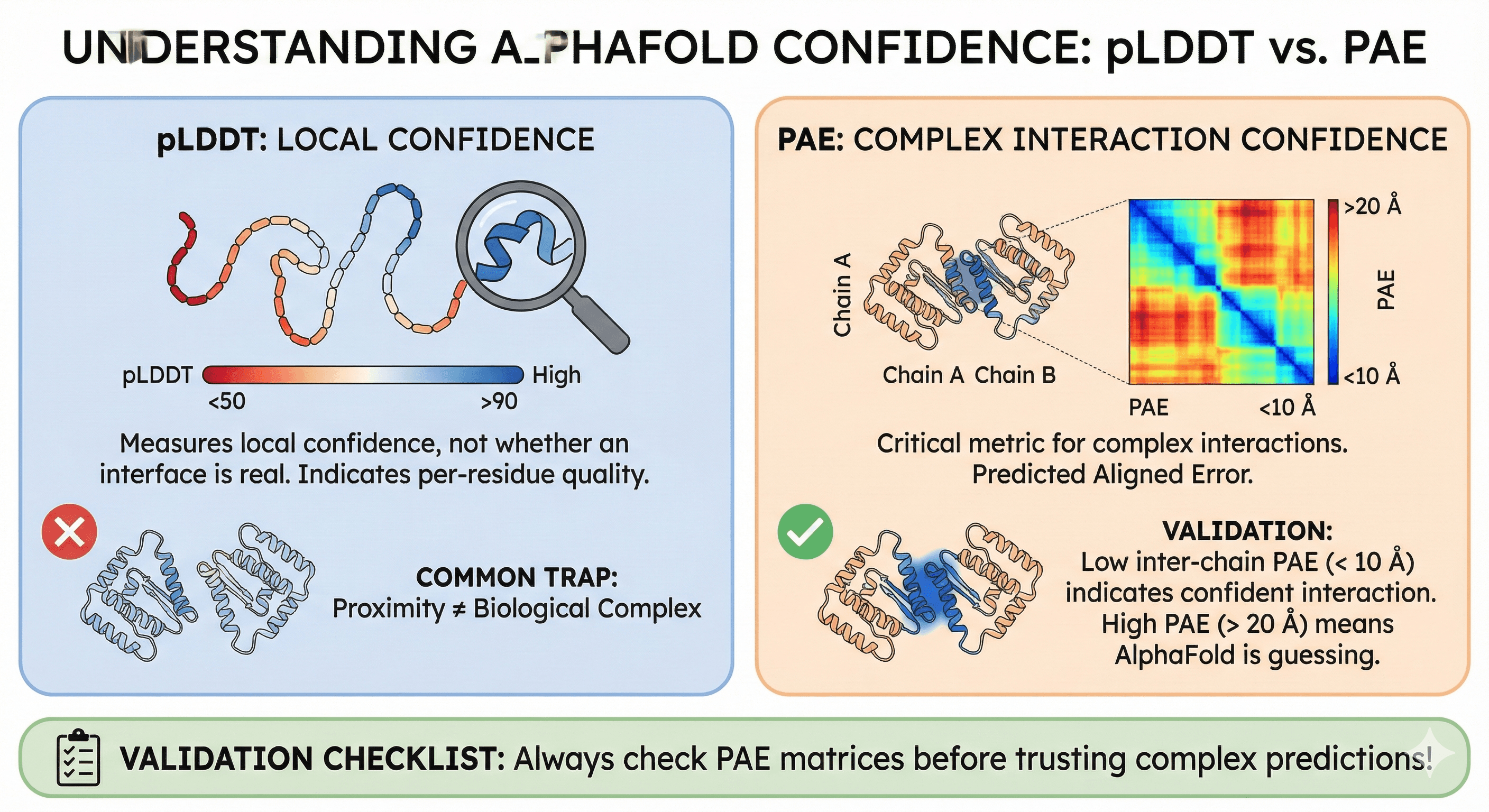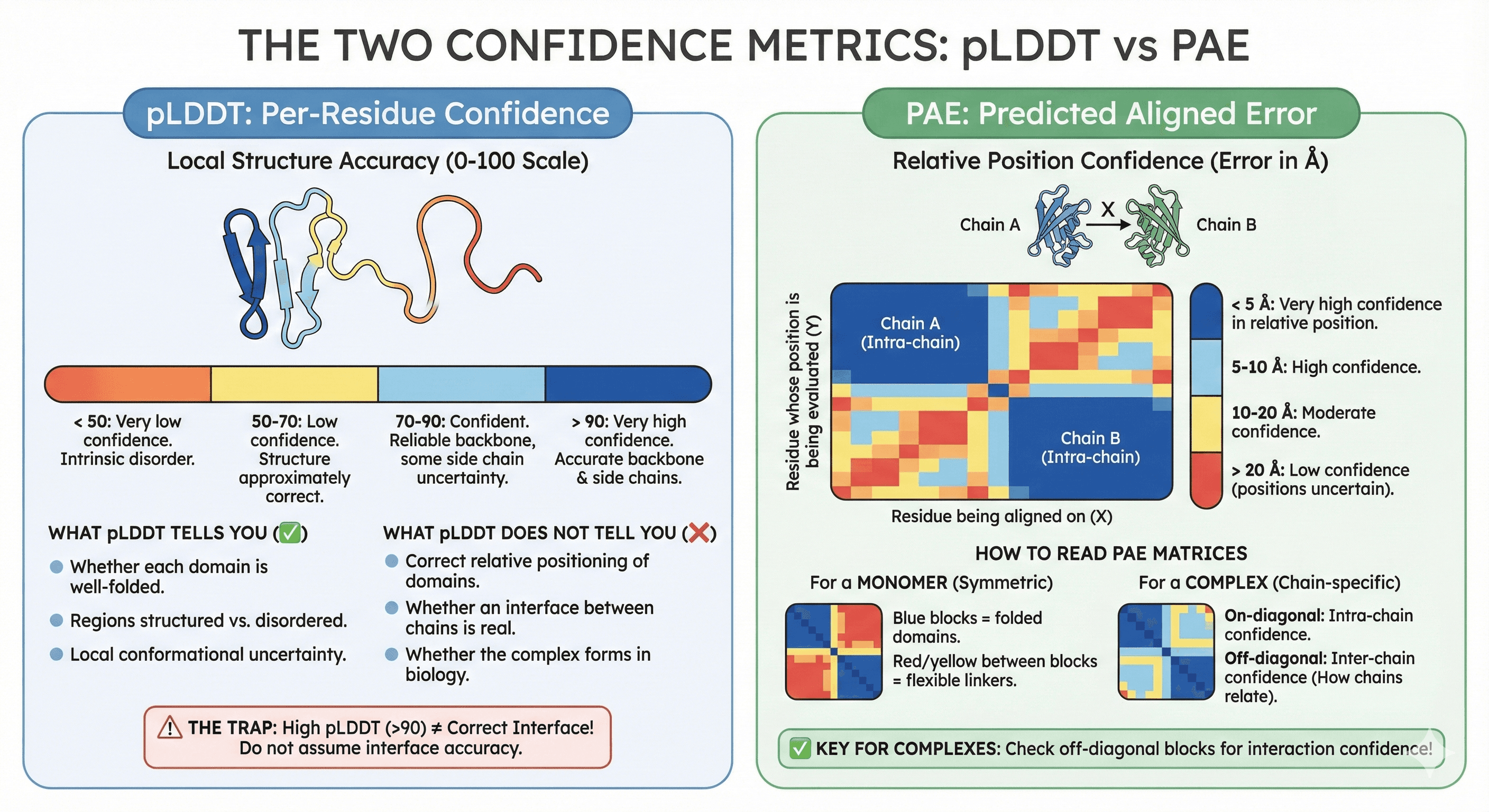 AlphaFold reports two confidence metrics. For monomers, pLDDT is usually sufficient. For complexes, PAE becomes essential.