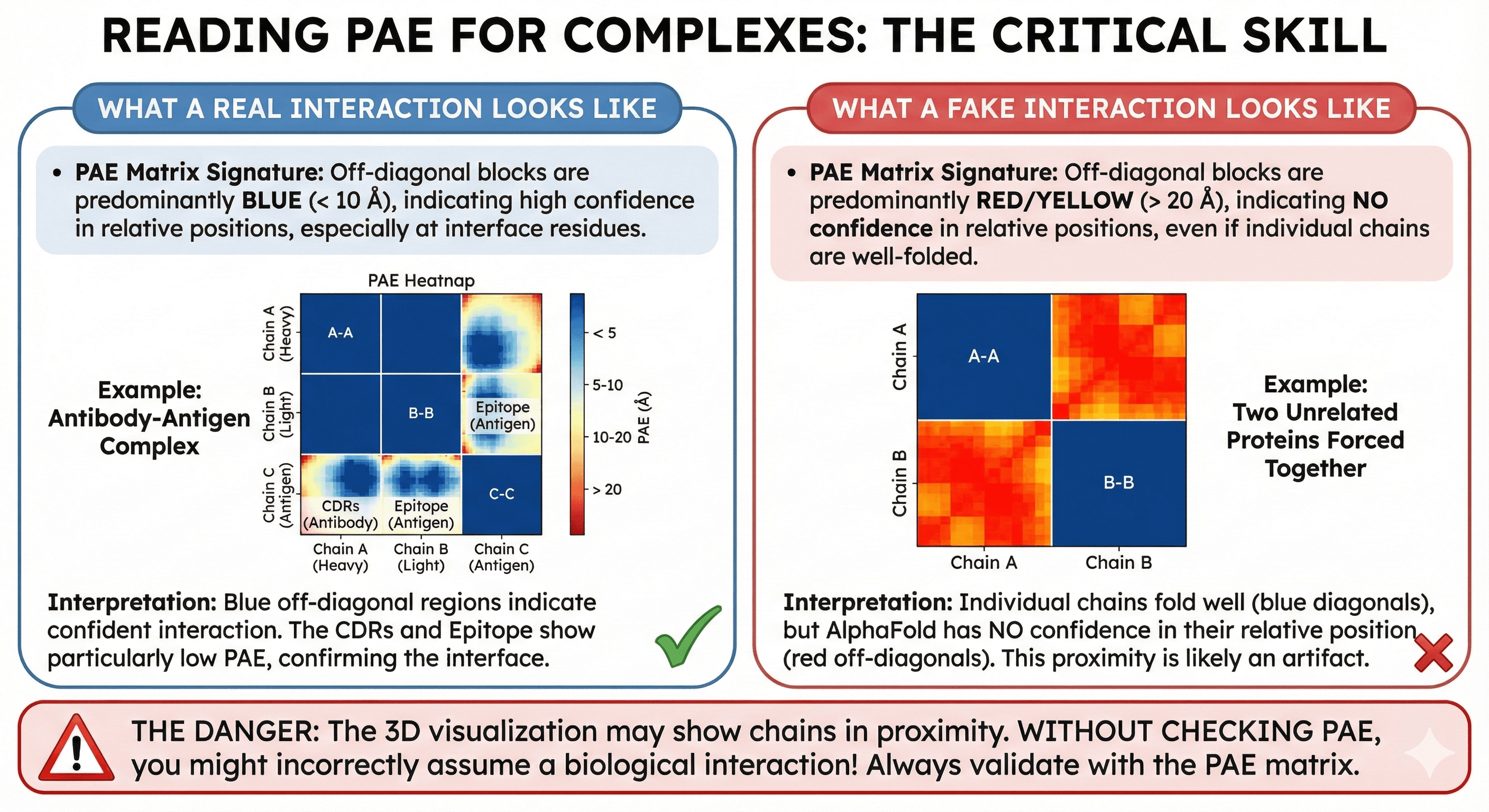 A beautiful 3D structure with two proteins touching means nothing if the PAE says AlphaFold was guessing. Conversely, a somewhat rough-looking interface with low PAE might be biologically accurate.