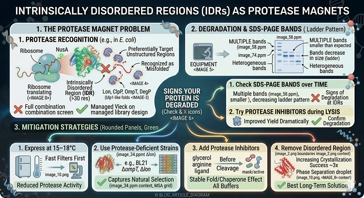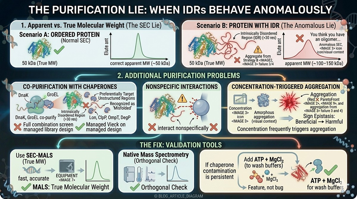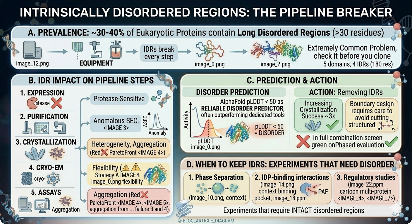 IDRs break every step of the pipeline: expression (protease-sensitive), purification (anomalous SEC), crystallization (heterogeneity), cryo-EM (flexibility), assays (aggregation)