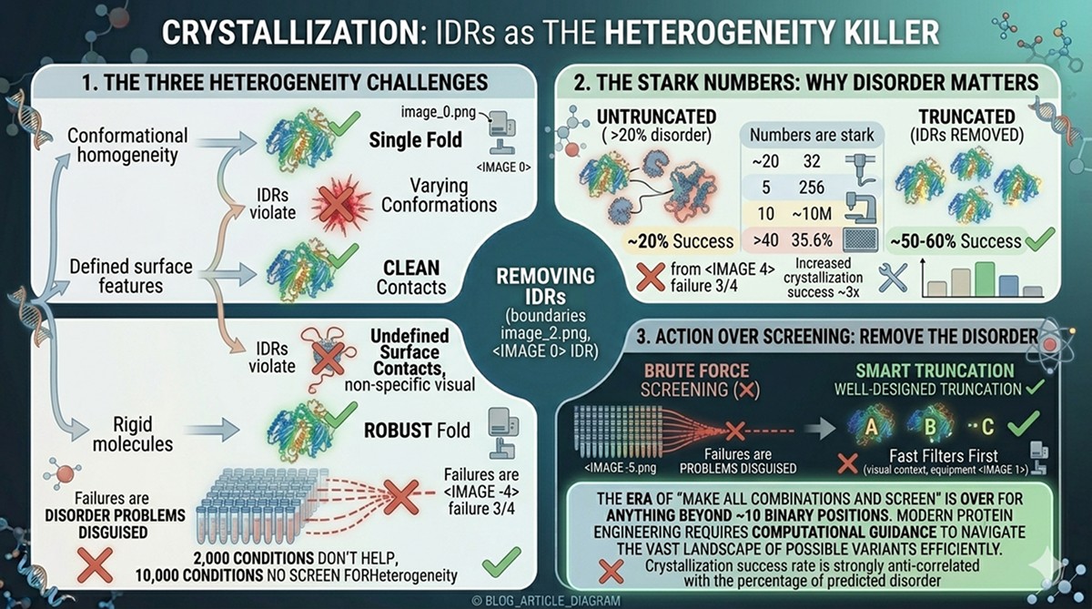 No crystallization condition can force a genuinely disordered region into a lattice. You can screen 10,000 conditions—if conformational heterogeneity is the problem, none will work.
