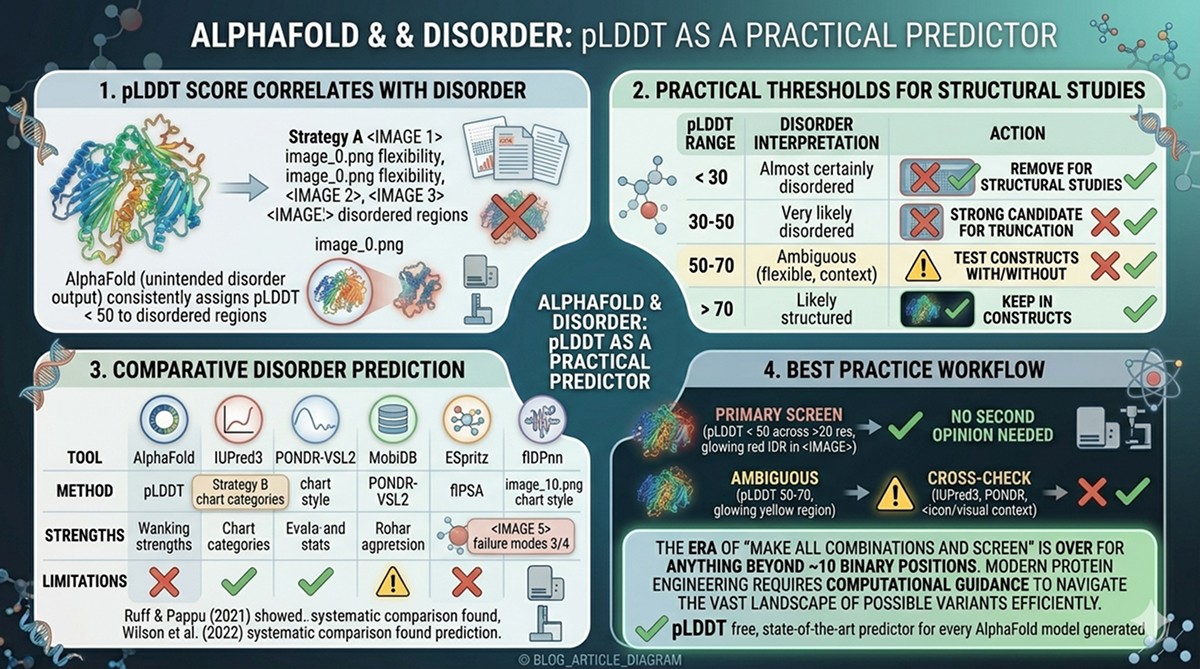 Best practice: Use AlphaFold pLDDT as your primary screen. If a region is pLDDT < 50 across >20 residues, it's disordered—you don't need a second opinion. For ambiguous regions (pLDDT 50–70), cross-check with IUPred3 or PONDR.