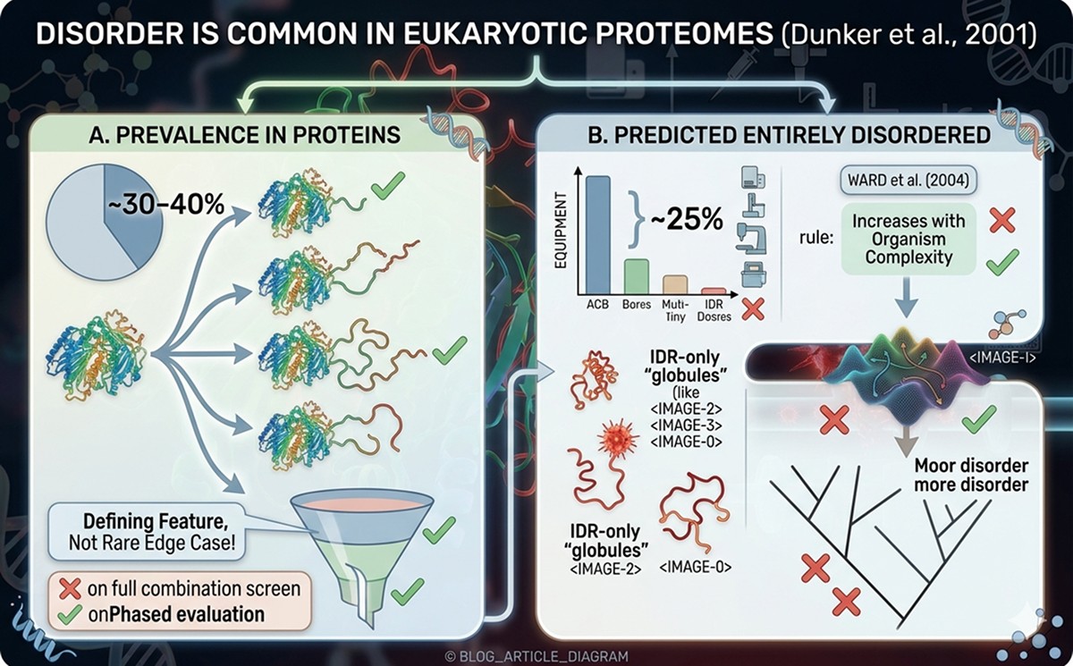 ~30–40% of eukaryotic proteins contain disordered regions longer than 30 residues (Dunker et al., 2001)