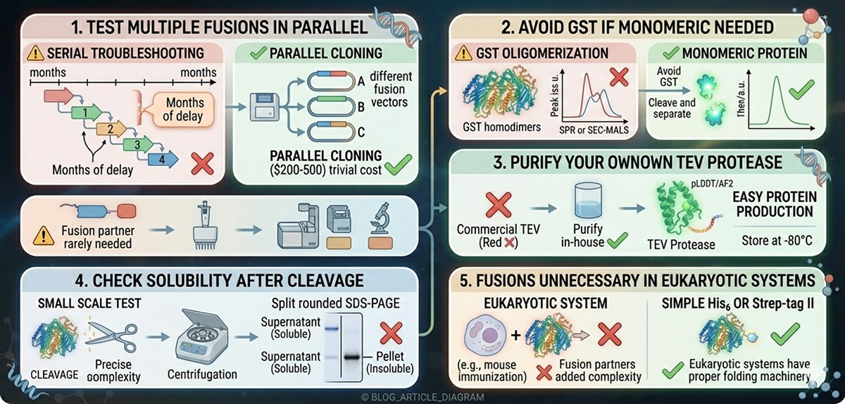 The fix: Clone your gene into 2–3 different fusion vectors simultaneously. The cost of parallel cloning (~$200–500) is trivial compared to months of serial troubleshooting.