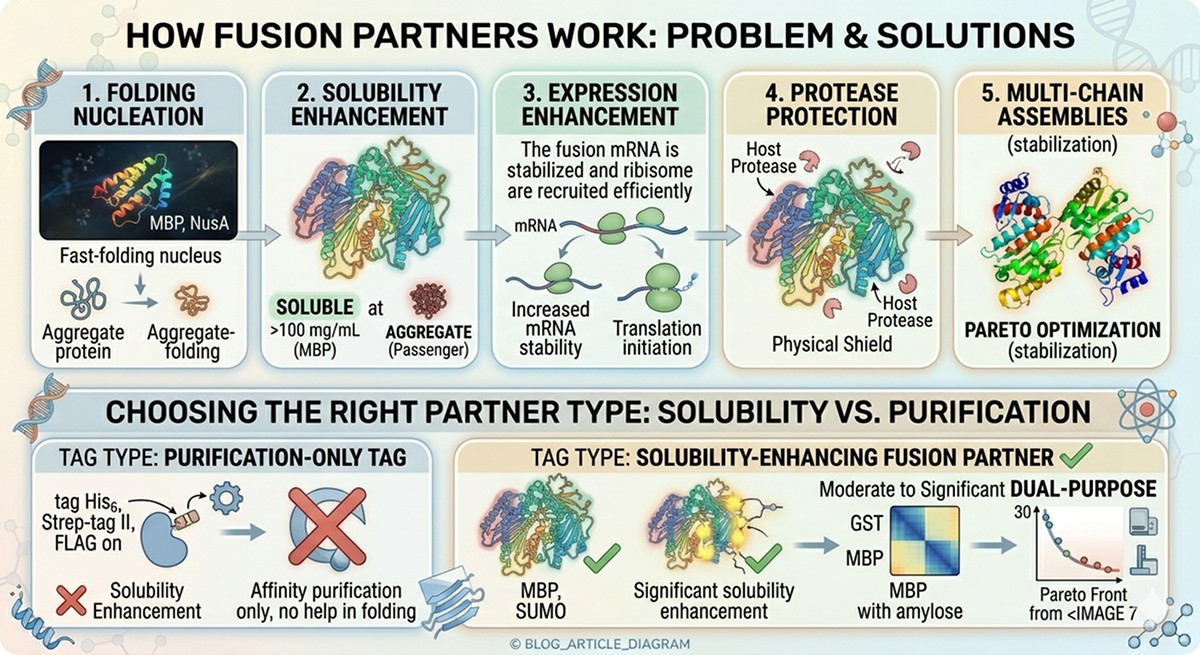 Your protein doesn't express solubly in E. coli. Your advisor says "try MBP." Your labmate swears by SUMO. The postdoc down the hall uses GST for everything. The vendor catalog lists fifteen different fusion systems, each claiming superior results. You have budget for three constructs. If you pick wrong, you've wasted a month of cloning and expression trials. If you pick right, you might go from zero soluble protein to milligrams in a week.