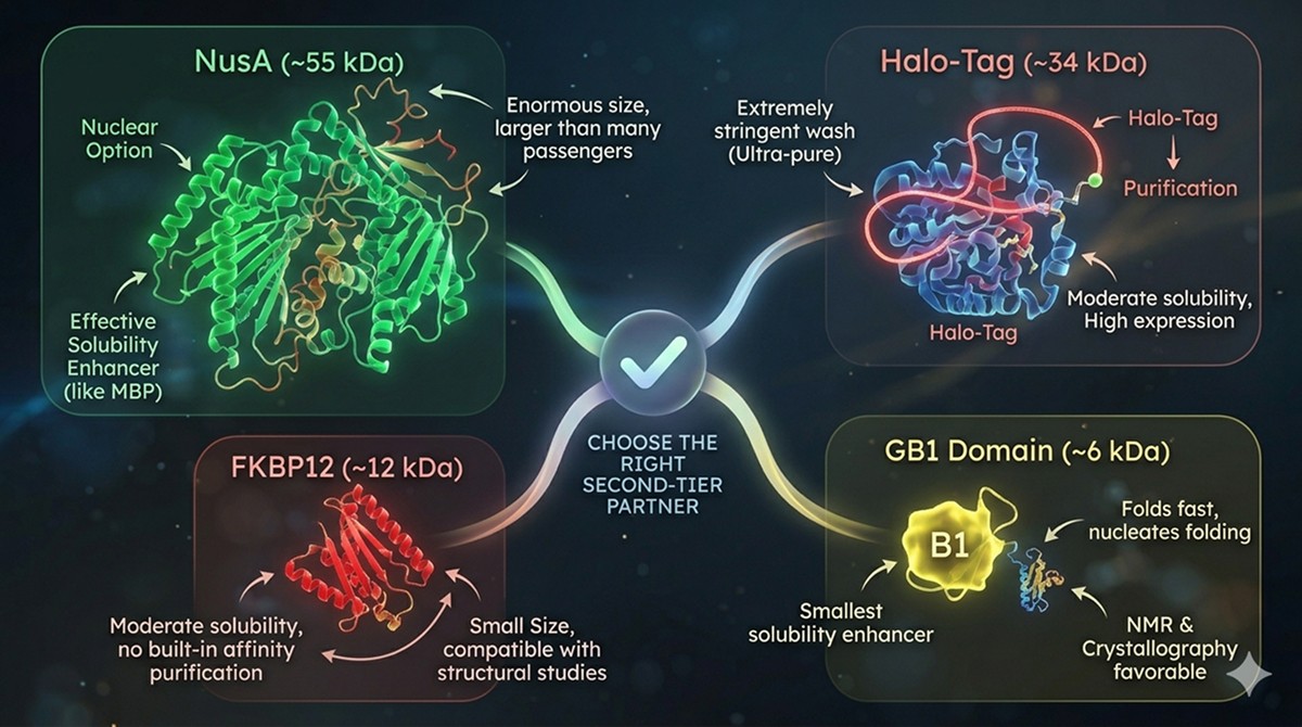 The "right" fusion partner depends on your protein's specific problems: PTM requirements, disulfide bonds, size, and downstream application should drive the choice