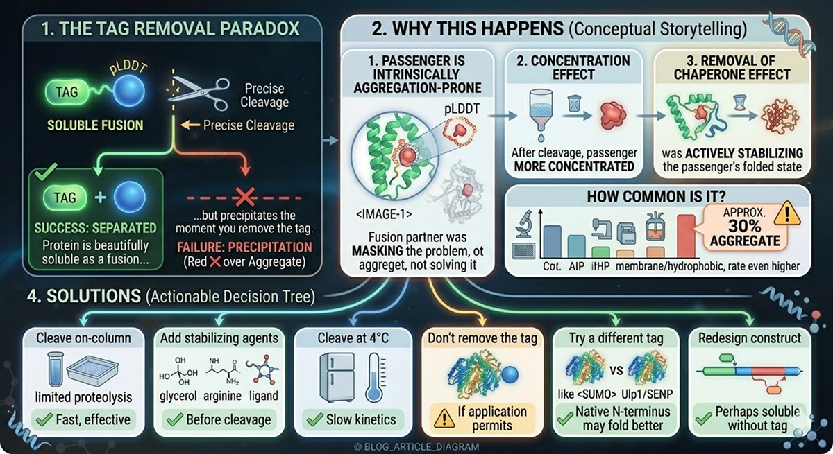 One of the most frustrating problems in fusion protein work: your protein is beautifully soluble as a fusion but precipitates the moment you remove the tag.
