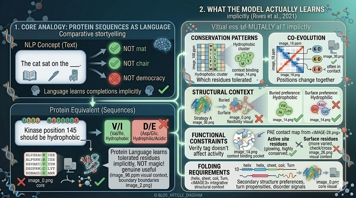 The key parallel: Just as a language model learns that "The cat sat on the ___" should be completed with "mat" or "chair" (not "democracy"), a protein language model learns that position 145 in a kinase should be a hydrophobic residue (not an aspartate)—without being told anything about kinases, hydrophobicity, or protein folding.