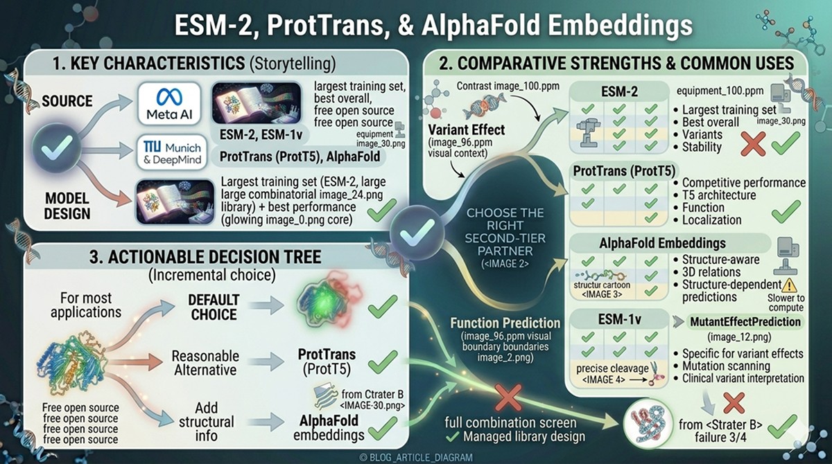 For most applications, ESM-2 (650M) is the default choice. It's well-validated, widely supported, and open source. ProtT5 is a reasonable alternative with similar performance. AlphaFold embeddings add structural information but are slower to compute.