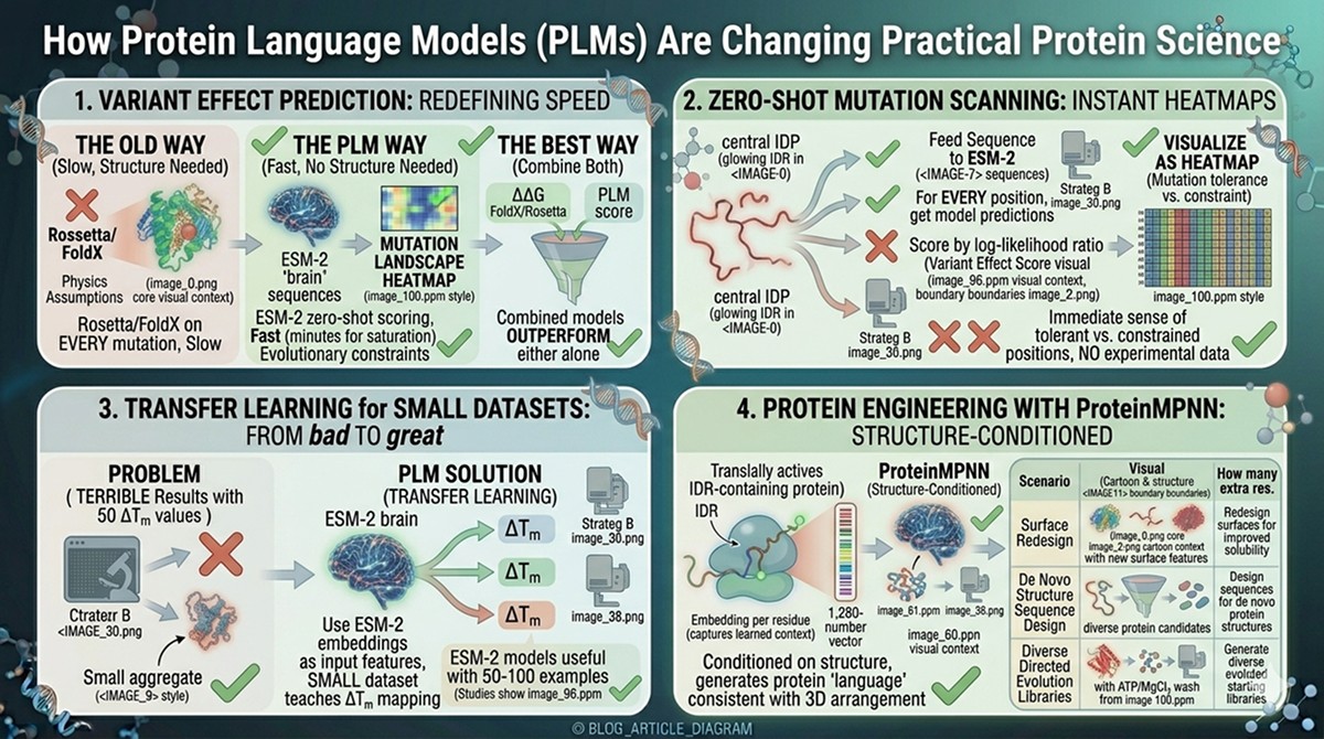 PLMs are genuinely useful but not magic: they excel at variant effect prediction and transfer learning for small datasets, but can't predict binding affinity or replace experimental validation