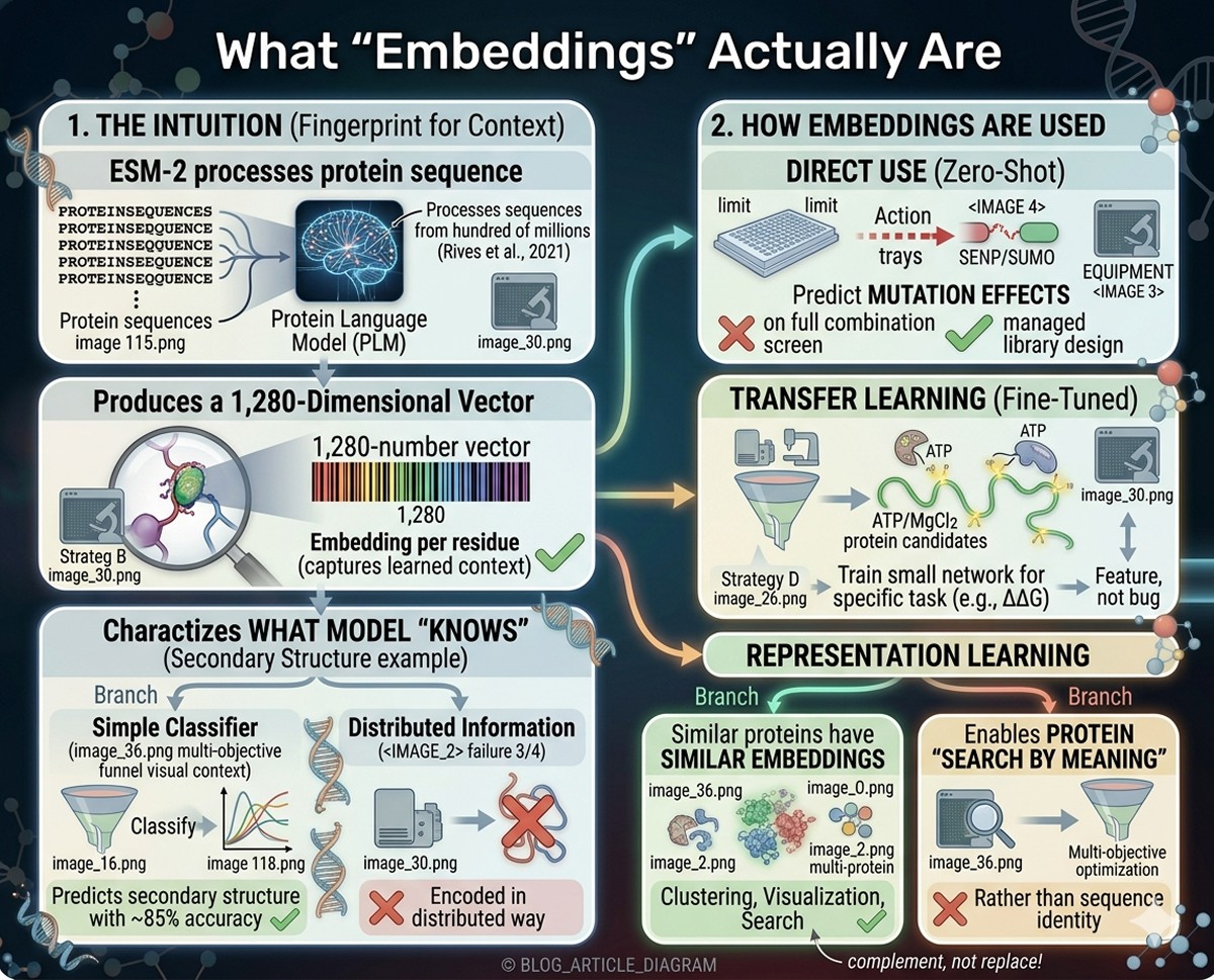 "What are embeddings?" | 1,280-number fingerprints per residue that encode everything the model learned about that position |