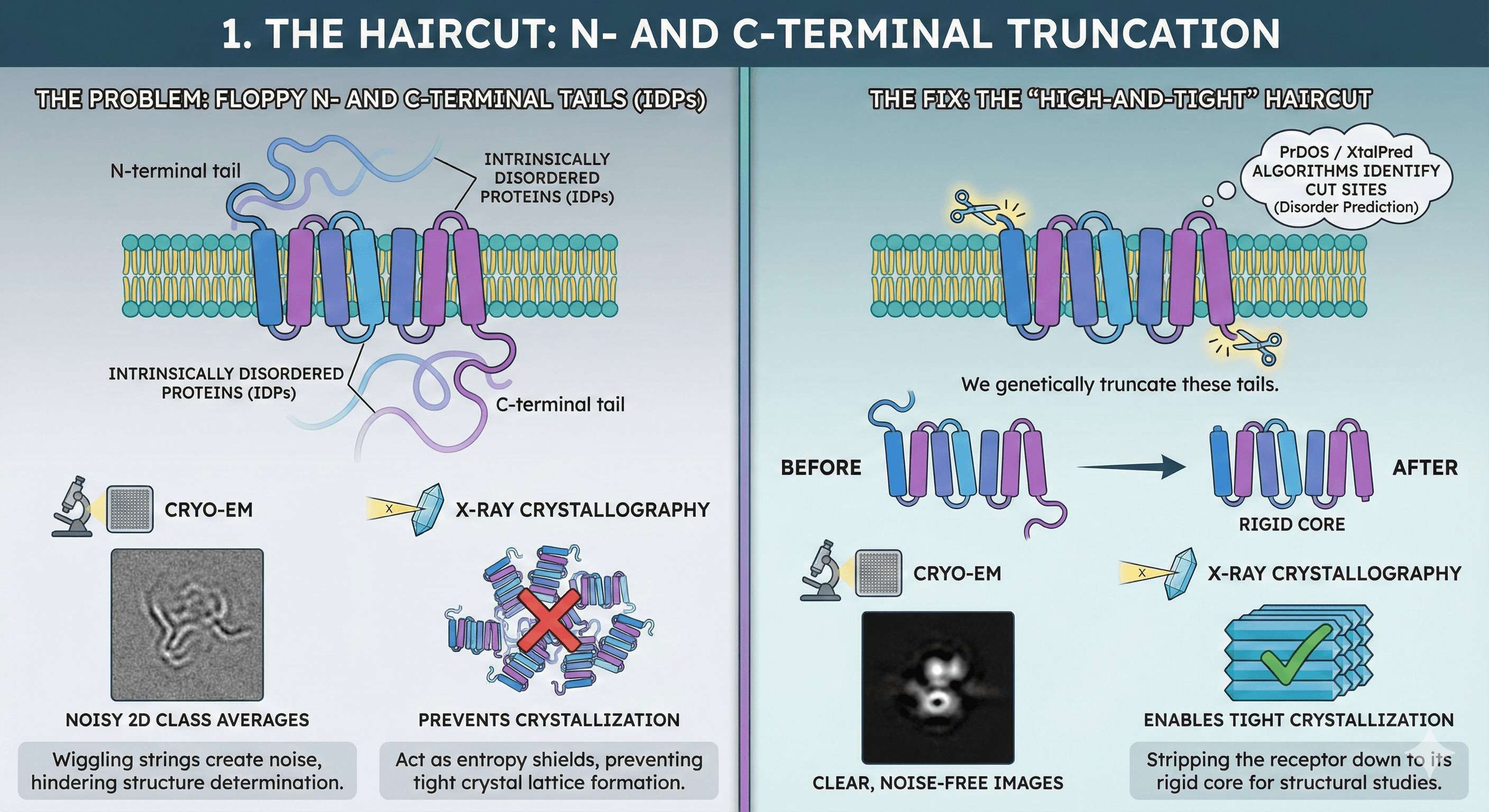 The Problem: Most GPCRs have long N-terminal and C-terminal tails. While biologically crucial for signaling (e.g., for β-arrestin recruitment or internalization), biophysically, these regions are usually Intrinsically Disordered Proteins (IDPs).