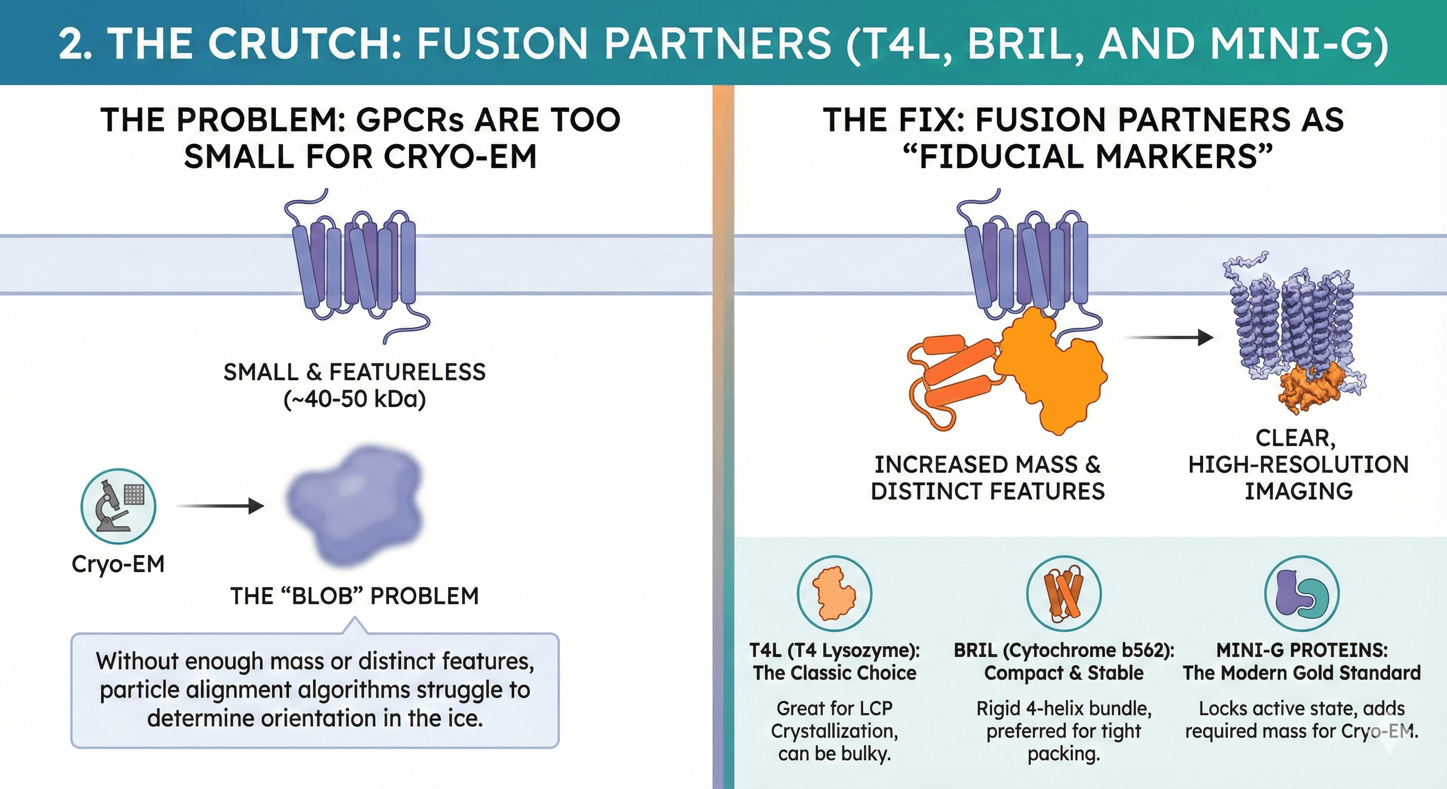 The Fix: We insert a rigid, soluble fusion protein to serve as a "fiducial marker"—a distinct shape for the microscope to lock onto. This is typically fused into the 3rd Intracellular Loop (ICL3) or attached to the N-terminus.