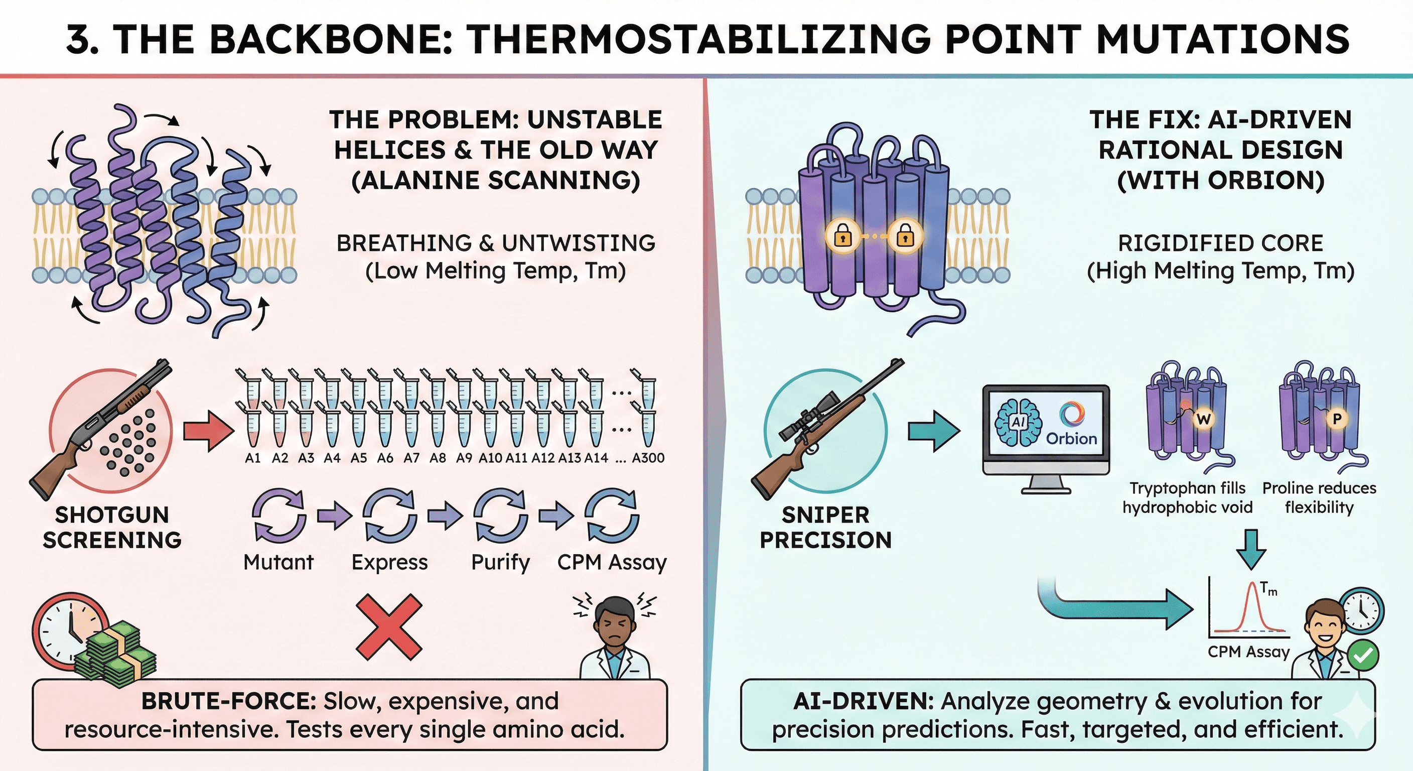 The New Way (Rational Design with Orbion): Today, we use AI-driven rational design. Platforms like Orbion analyze the geometry and evolutionary history of the protein to make precision predictions. Instead of testing 300 random mutants, Orbion might suggest: "Change Residue 124 to Tryptophan to fill this hydrophobic void," or "Mutate Residue 340 to Proline to reduce helix flexibility." This moves the workflow from "shotgun" screening to "sniper" precision.